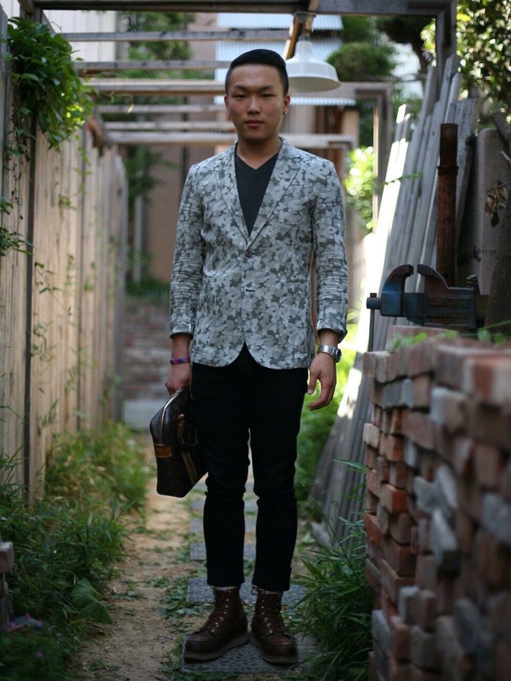 ブラウン系のその他シューズ、ホワイト系のその他を着用したメンズの夏コーディネートの1枚目の写真