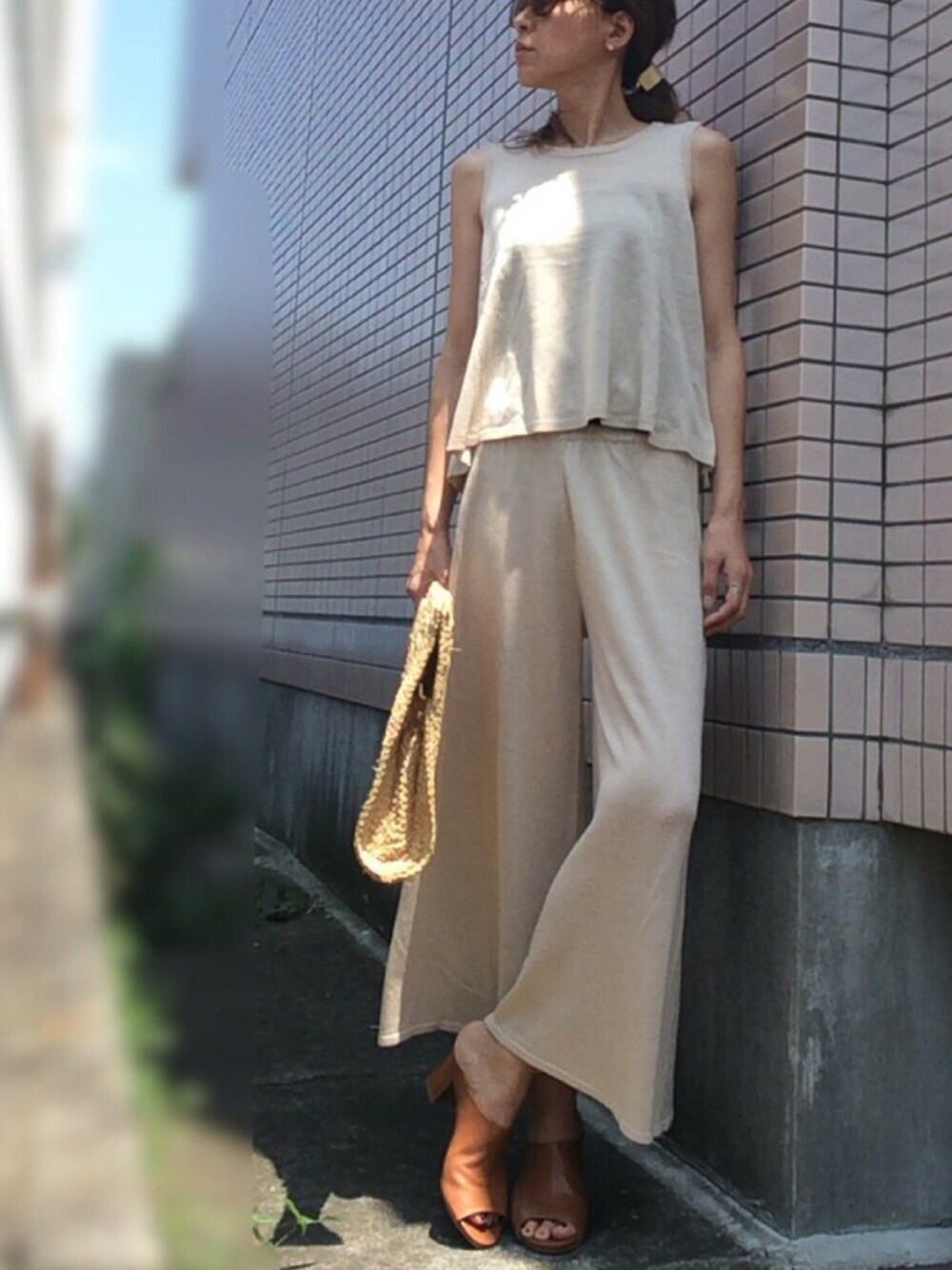 ベージュ系のかごバッグ、ブラウン系のサンダルを着用したレディースの夏コーディネートの1枚目の写真