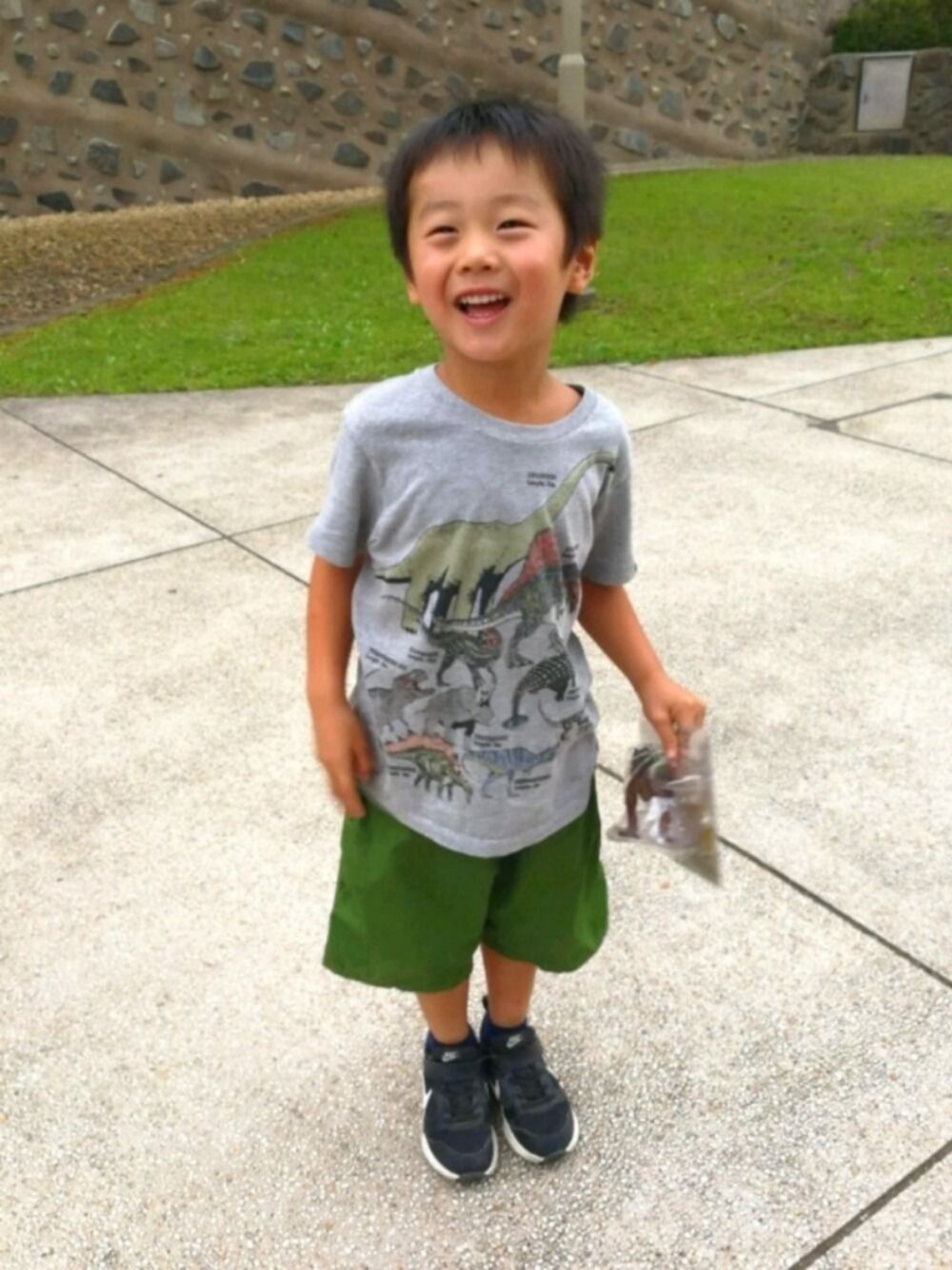 群馬に遊びに来ました♪ 博物館へ行くので恐竜柄のTシャツをチョイス。 左手には博物館で購入したティラノサウルス。