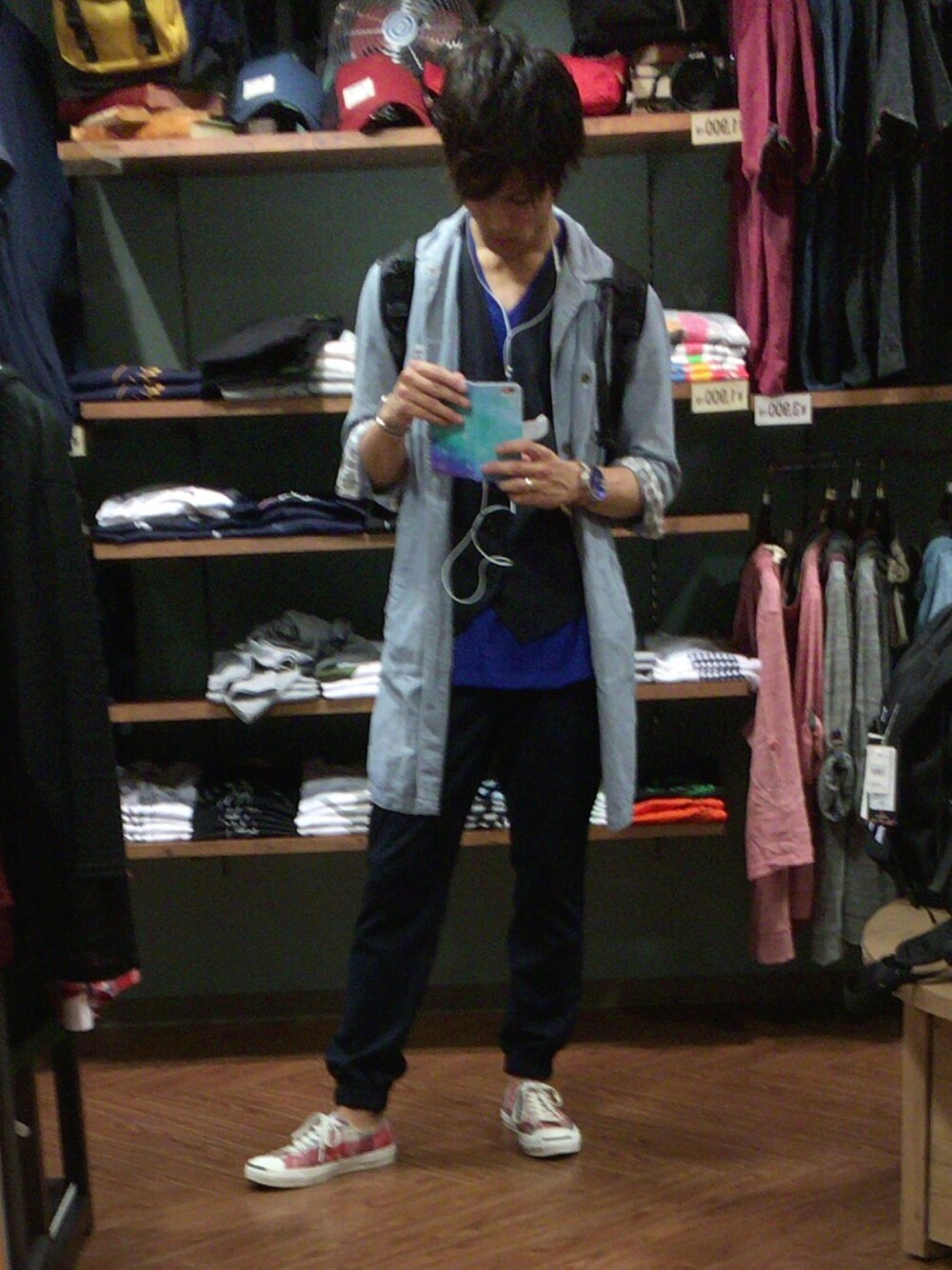 今日は暖かかったのでインナーは半袖で ベストを着て薄いロングジャケットを羽織りました! 全体的に青ベースだったので アクセントにシューズは 赤チェックのジャックパーセルにしました! だんだんと暖かくなってきてるので毎日着る服を選ぶのが楽しいですね!(*ˊ˘ˋ*)。♪:*°