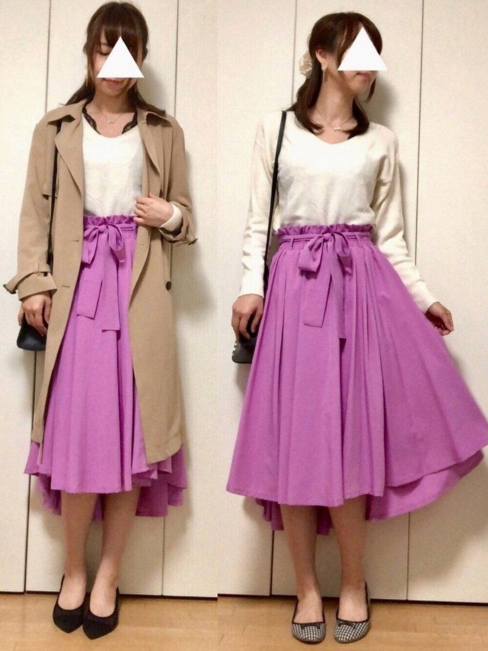 ご覧いただきありがとうございます😊✨ 1年前くらいに購入したラベンダーともピンクとも取れるスカート。 写りかたによって全然色合いの変わるスカートです( ̄▽ ̄) スカートって履いてるだけで女の子らしくなれる(ような気がする)し、 何よりこのスカートの質感と揺れ具合がたまらなく好きです☺️ 最近寒かったりするのでまだ薄手のニットが手離せない…この時期ほんと何着たら良いのか悩みます😣💦 ニットからはレースチラ見せな感じで、 小物とかを黒で合わせてみました🙌 いつもいいね、お気に入り、フォローありがとうございます🙇♀️💕