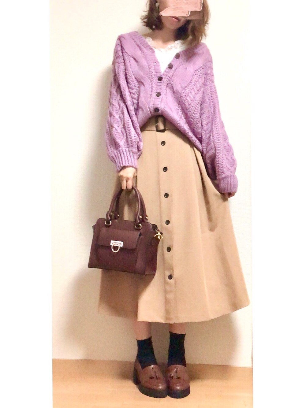 ご覧いただきありがとうございます😊 ナイスクラップと、イングコーデ👍🙌 ニットカーディガンはピンクと書いて会ったけど実際紫寄りな色合いです☺️ 最近こういう色に弱い☺️笑 すごくあったかくって、ゆったりしたシルエットも好み🙆♀️ ボタンが高見えする気がする✨ スカートのボタンと似てるから繋がってるみたいに見えるwボタンだらけ🤣 スカートは薄手なんだけど下に何か履けばまだいけそうかな☺️ バッグと靴の色を合わせました🙌 いいね、お気に入り、フォローも本当にありがとうございます🙇♀️💕