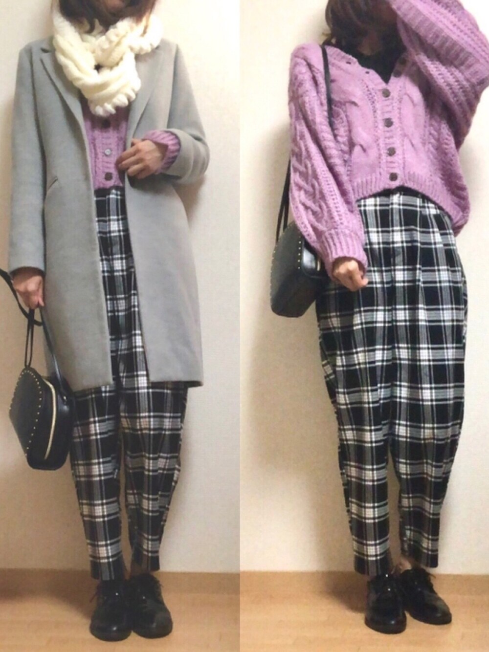 ご覧いただきありがとうございます😊 モノトーンにラベンダーニットで差し色🙌 ニットカーディガンは袖がボリュームあって可愛いです😊 グレーのチェスターコートは使い勝手が良くて重宝してます。モノトーンチェックのパンツも買って良かった🤤 しまむらのハーフムーンのショルダーバッグもとても使い勝手いいです♫ いいね、お気に入り、フォローも本当にありがとうございます!🙇♀️✨