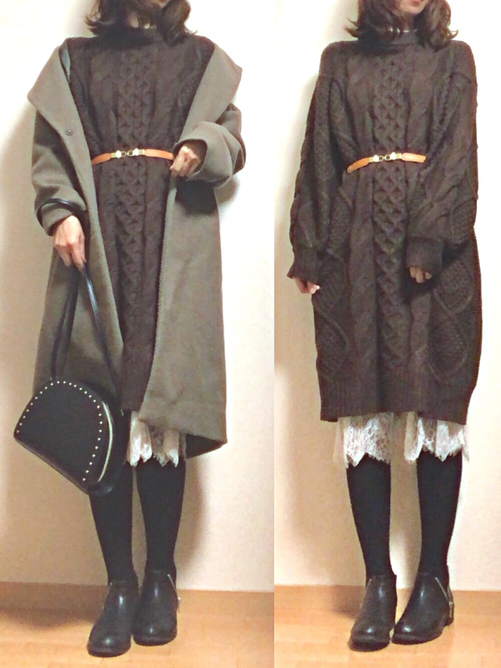 ご覧いただきありがとうございます😊 チョコレート色のニットワンピースにレースのスカートをレイヤード🙌 全体的にブラウン系でまとめました。 ウエストマークの細ベルトがアクセント🙌 いいね、お気に入り、フォローも本当にありがとうございます!🙇♀️✨