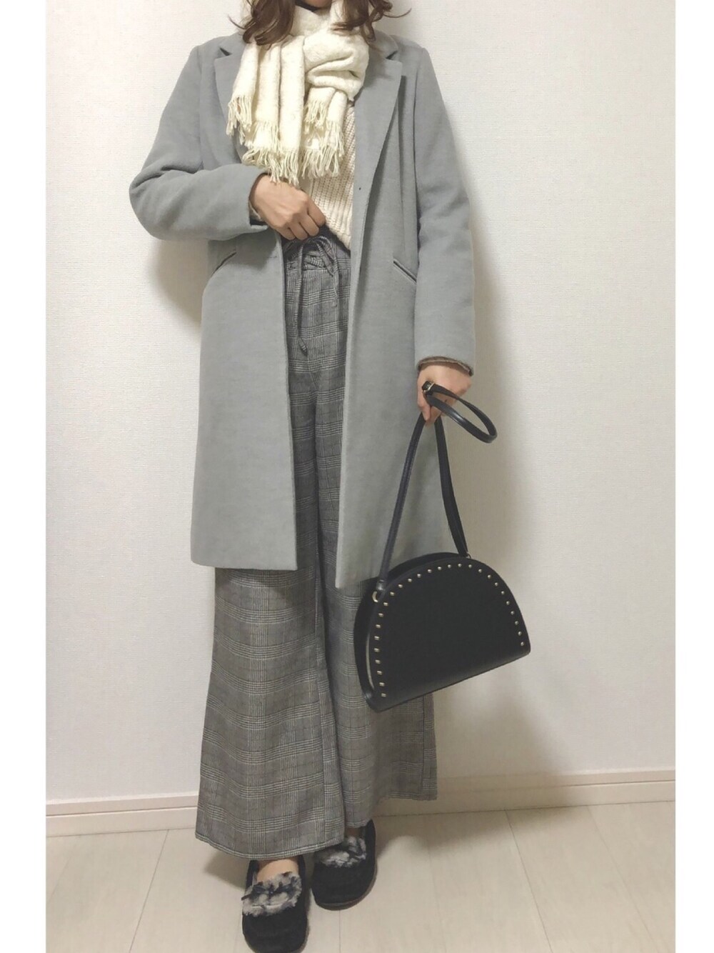 ご覧いただきありがとうございます😊 グレーのチェスターコートでワントーンコーデ🙌 グレンチェックのワイドパンツもとても使えるアイテム。足元はモカシンでもふもふあったかいです☺️ いつもいいね、お気に入り、フォローも本当にありがとうございます!🙇♀️✨