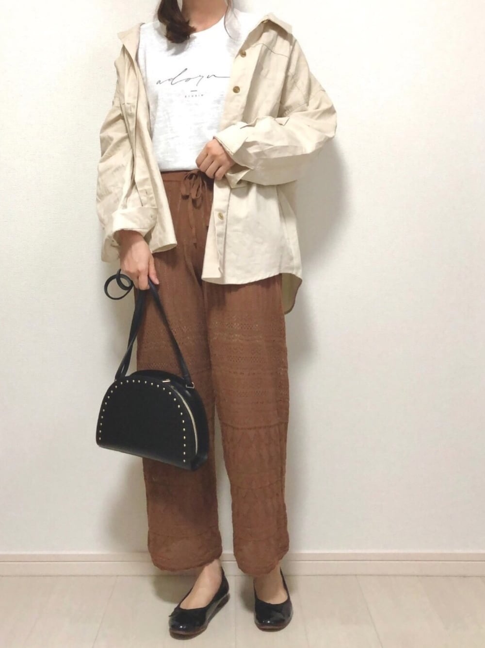 ご覧いただきありがとうございます😊 ロゴTとレースパンツでリラックスコーデ🙌 ちょっと羽織でシャツをプラス👔 ブラウン系のワントーンでまとめました^_^ いつもいいね、お気に入り、フォローも本当にありがとうございます🙇♀️🍀 フォルダに入れてくださった方もありがとうございます🙇♀️🙇♀️🙇♀️