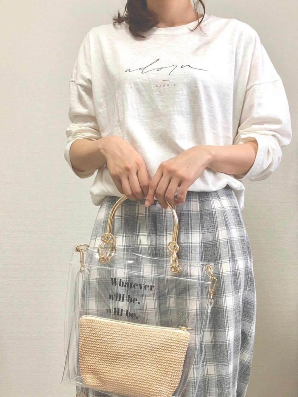 ご覧いただきありがとうございます☺︎ 白×グレーのモノトーンコーデにクリアバッグでシンプルに🙌 持ち手がゴールドで高見えする気がします☺️(単純) 中のポーチを変えたりして色んなパターン楽しめそうです🍀 いつもいいね、お気に入り、フォローも本当にありがとうございます🙇♀️🍀 フォルダに入れてくださった方もありがとうございます!とても嬉しいです☺︎