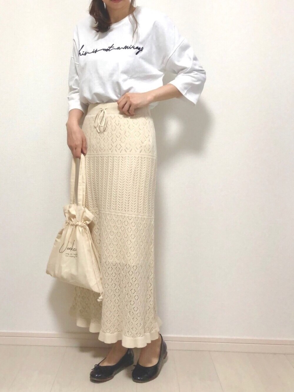 ご覧いただきありがとうございます☺︎ シンプルプチプラコーデ🙌 ロゴがぷっくり浮き上がっててとても可愛いです☺️ GUの透かし編みニットのスカートはナチュラルな色合いが使い勝手良くて好きです^_^ いつもいいね、お気に入り、フォローも本当にありがとうございます🙇♀️🍀