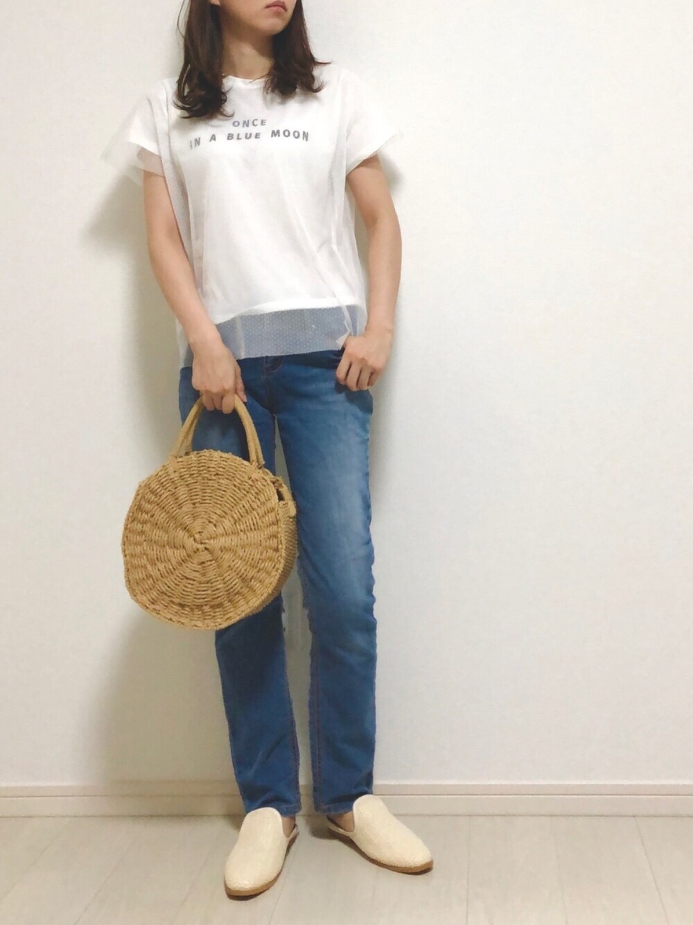 ご覧いただきありがとうございます☺︎ 白Tシャツとデニムパンツでシンプルに🙌 白Tはチュール素材も混じってて可愛いです☺️ GUのバブーシュが履きやすくて最近のお気に入り☺️♫ いつもいいね、お気に入り、フォローやフォルダも本当にありがとうございます🙇♀️🍀