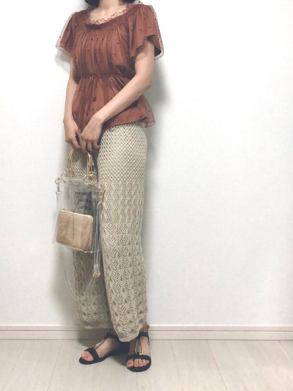 ご覧いただきありがとうございます☺︎ ブラウンとベージュのワントーンコーデ🙌 チュールトップスのひらひら具合が可愛いです☺️ニットパンツは柔らかくて履き心地抜群◎ いいね、お気に入り、フォローも本当にありがとうございます🙇♀️🌻