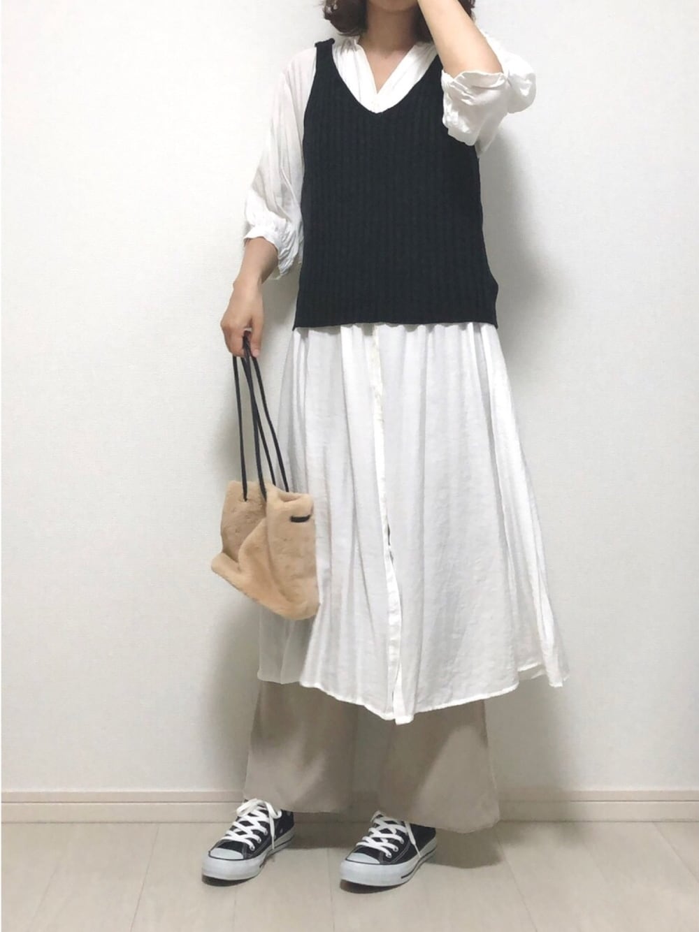 ご覧いただきありがとうございます☺︎ だいぶ前に買ったセットについてたニットビスチェと、白ワンピース🙌 リブパンツとスニーカーで動きやすい感じに^_^ ファーバッグの季節がやってきたなぁと感じます☺️🍁 いいね、お気に入り、フォローも本当にありがとうございます🙇♀️✨