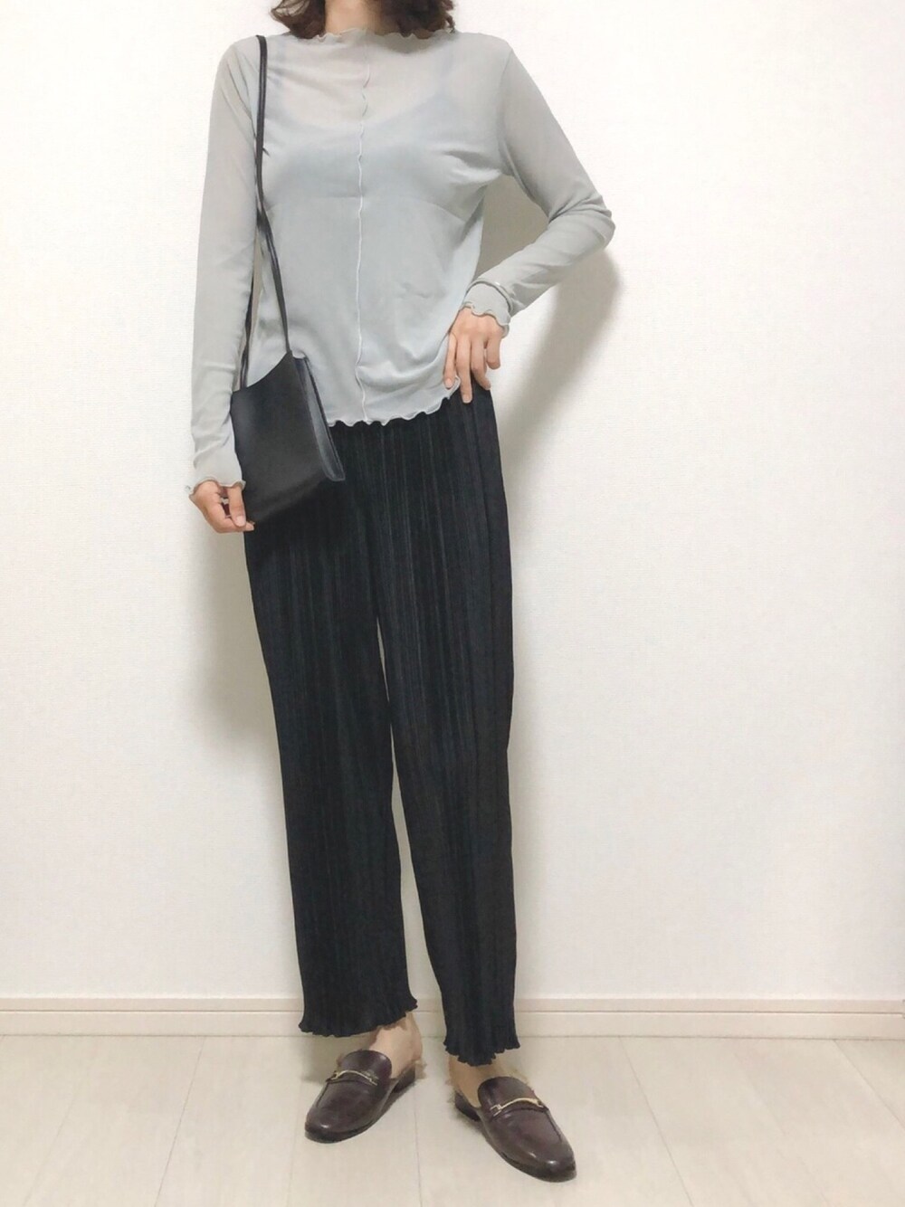 ご覧いただきありがとうございます☺︎ メローのシアートップスがとても着心地良くてお気に入りです☺️ プリーツパンツも履き心地抜群🙆♀️ バッグは3coinsです(^^) いいね、お気に入り、フォローも本当にありがとうございます🙇♀️✨