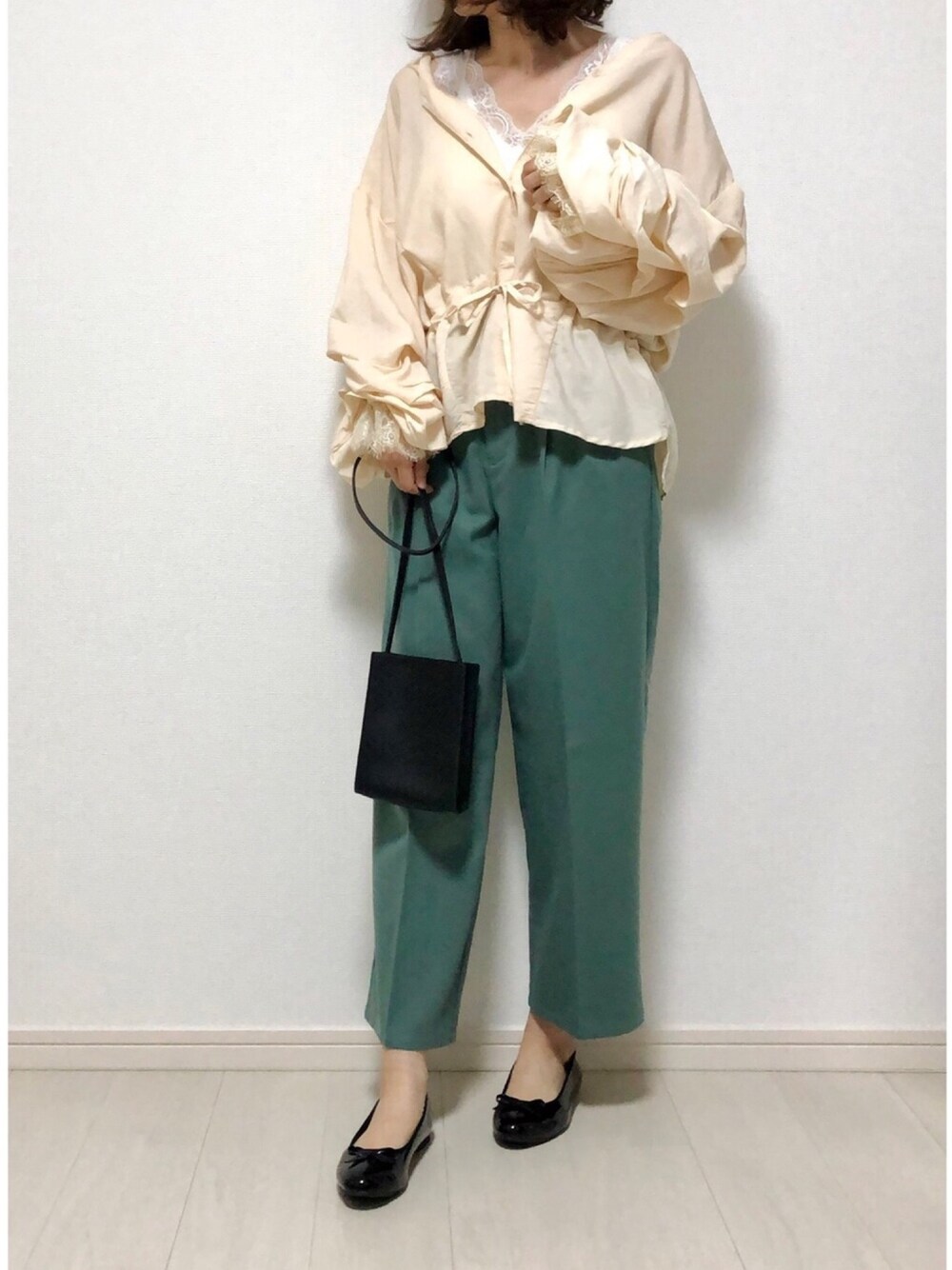 ご覧いただきありがとうございます☺︎ ふんわりやわらかい色のブラウスにカラーパンツでメリハリを🍀 このグリーンがとても好きで合わせやすいです☺️ 小物は黒でまとめました🙌 いいね、お気に入り、フォローも本当にありがとうございます🙇♀️✨
