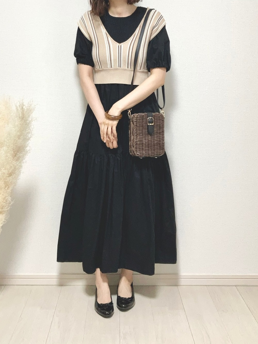 ご覧いただきありがとうございます☺︎ ティアードワンピースは黒なので甘過ぎない印象で着やすいです^_^ マルチストライプのニットビスチェを合わせました。黒だけでもシンプルで好きだけどベージュやブラウンを入れるとちょっと印象が柔らかくなる気がします🌿 いつもいいね、お気に入り、フォローやフォルダINも本当にありがとうございます🙇♀️🌿 …初めて動画の投稿もしてみたけど(Instagramも)、画質が荒過ぎて何が何やらになってしまいました😂なかなか難しいですね〜💦笑