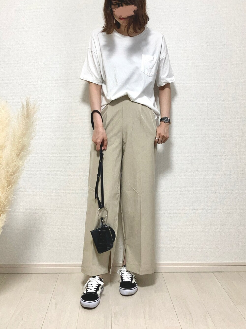 ご覧いただきありがとうございます☺︎ 白Tシャツとベージュのスリットパンツのシンプルコーデ🙌 小物は黒で⚫️ VANSのスニーカーでちょっとアクセント👟 いつもいいね、お気に入り、フォローやフォルダINも本当にありがとうございます!とても嬉しいです🙇♀️✨