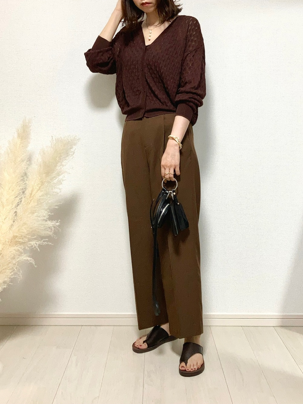 ご覧いただきありがとうございます☺︎ 夏バテで何も考えずボーッと組んだコーデ(笑) ワントーンコーデにするとまとまって、そんな手抜きには見えない…かも?笑 まだまだ暑いけど、透かし編みのカーディガンと、リネンライクなパンツで快適に◎ 色味だけでもブラウンで秋色🟤 いつもいいね、お気に入り、フォローやフォルダINも本当にありがとうございます🙇♀️とても嬉しいです✨