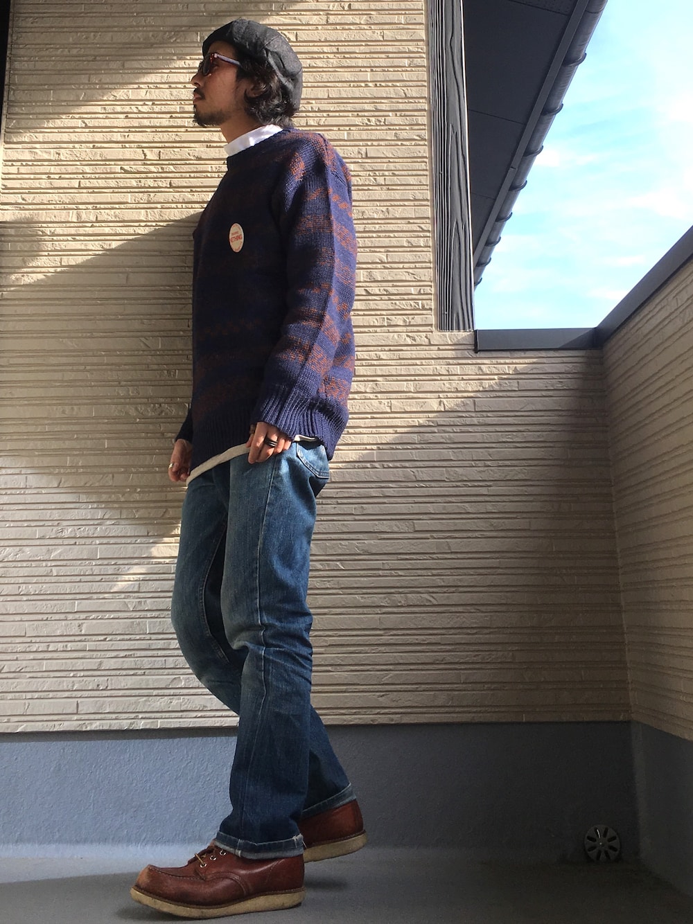 20180105Fri. ニット×デニムの定番コーデ。 に、白のモックネック×ベレー帽×缶バッヂで変化を与える。 とりあえずこのニットが590円の大量生産品だからね。。
