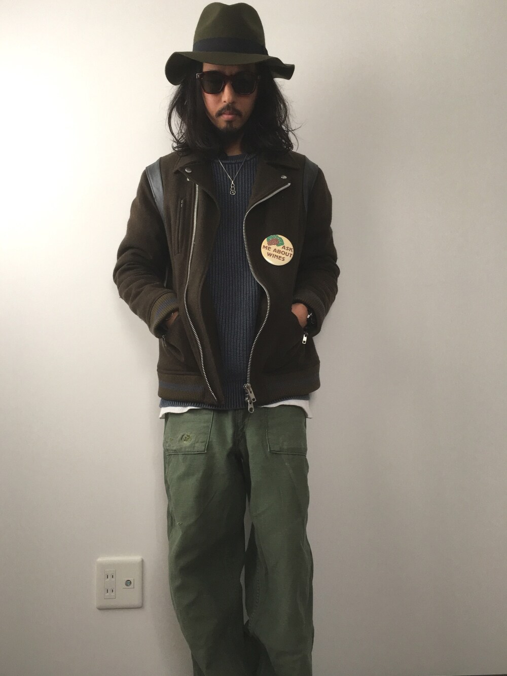 20170114Sat. オリーブ攻めのハイ&ロウ。 ハット/¥190(GU) ライダース/¥42,000 (whiz)