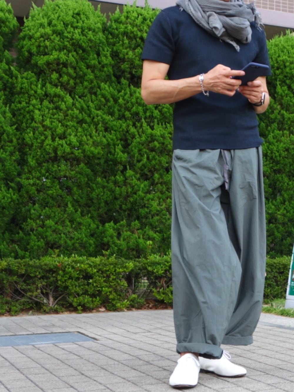 久しぶりに投稿。最近の気温・気候に合わせたお気に入りコーデを。RAINMAKERのDOUGI PANTSにUNIQLO Uの半袖ニットを合わせて。心地よさがなんとも言えないコーデです。