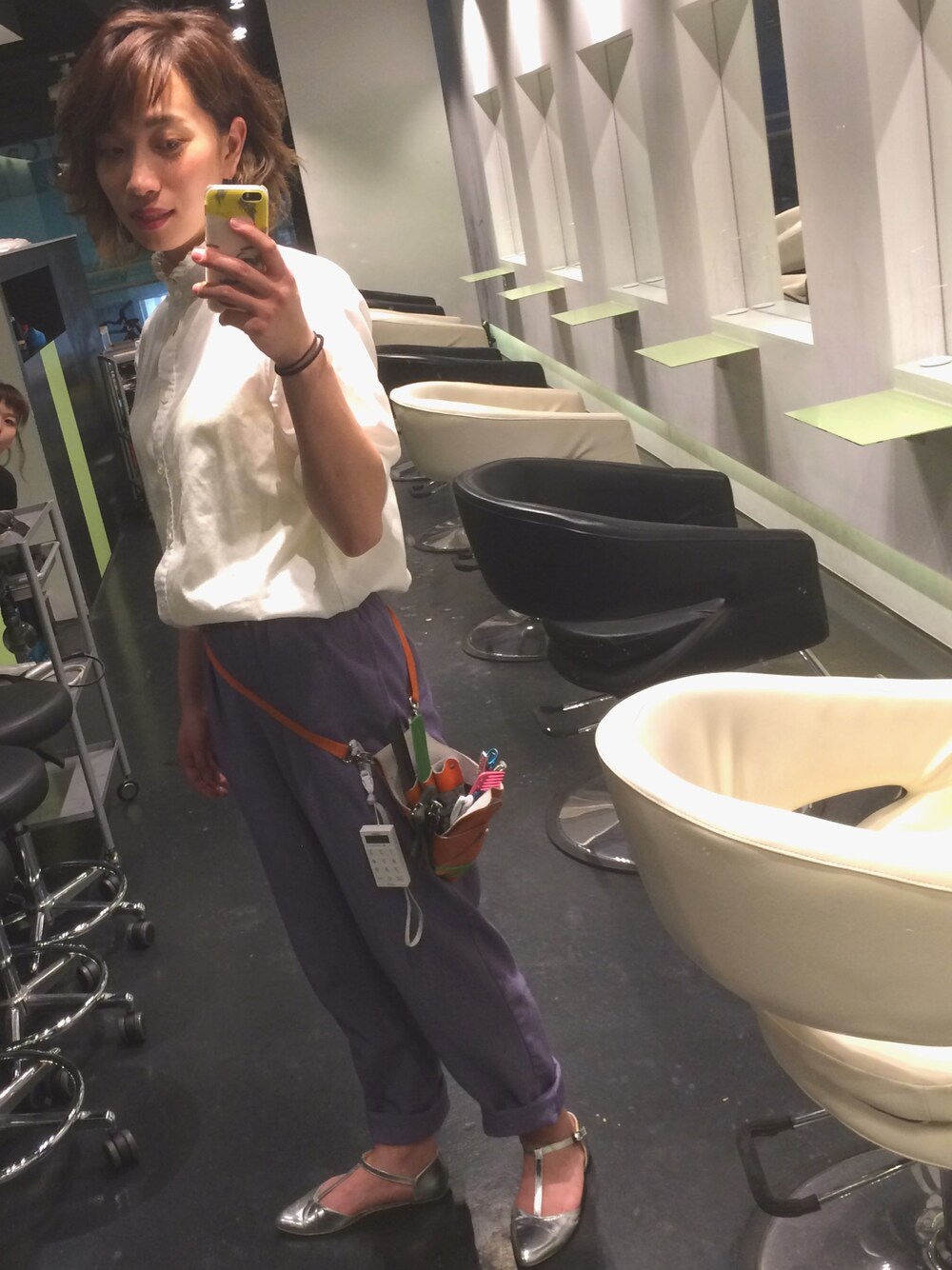 白シャツ➕シルバーシューズ✖️テロテロラフパン 締めつつもゆる〜く呑気に働きました UNIQLOシャツの襟元は可愛い首つまりでございますわ