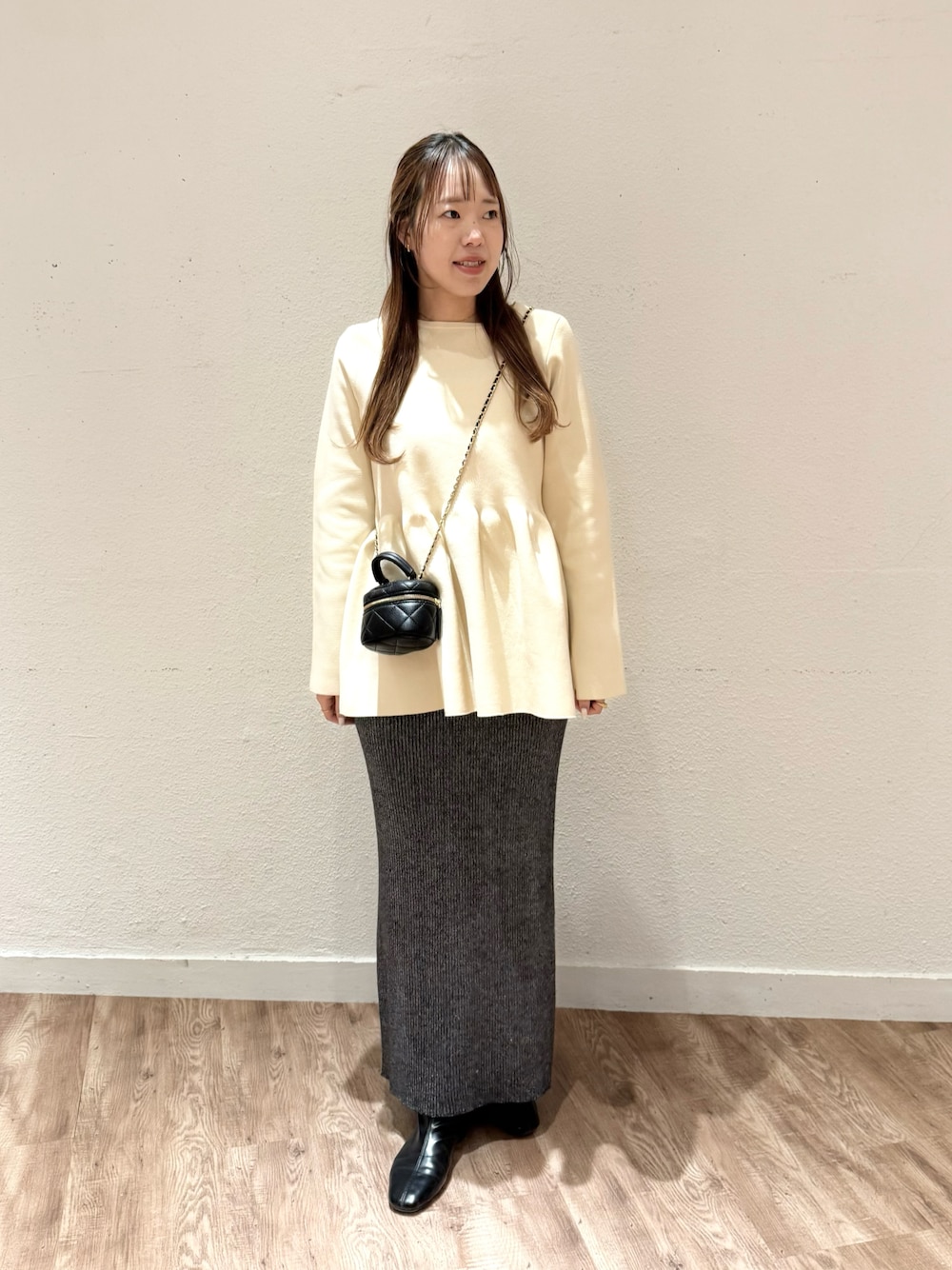 フレアニットとIラインのスカートは相性抜群◎ トップスはハリ感があり期になる腰回りも隠れる丈感で安心✨