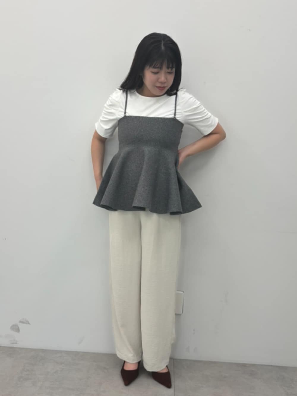 ========== ■シルキータッチ袖ギャザートップス S/White 46-250305001-04 ¥1,490 →実店舗/WEB 販売中 ■スポンディッシュニットキャミソール M/Gray 36-240726005-09 ¥1,990 →実店舗/WEB 販売中 ■シボサテンライクイージーパンツ S/Lt.beige 36-230314003-14 ¥1,990 →実店舗/WEB 販売中 ==========