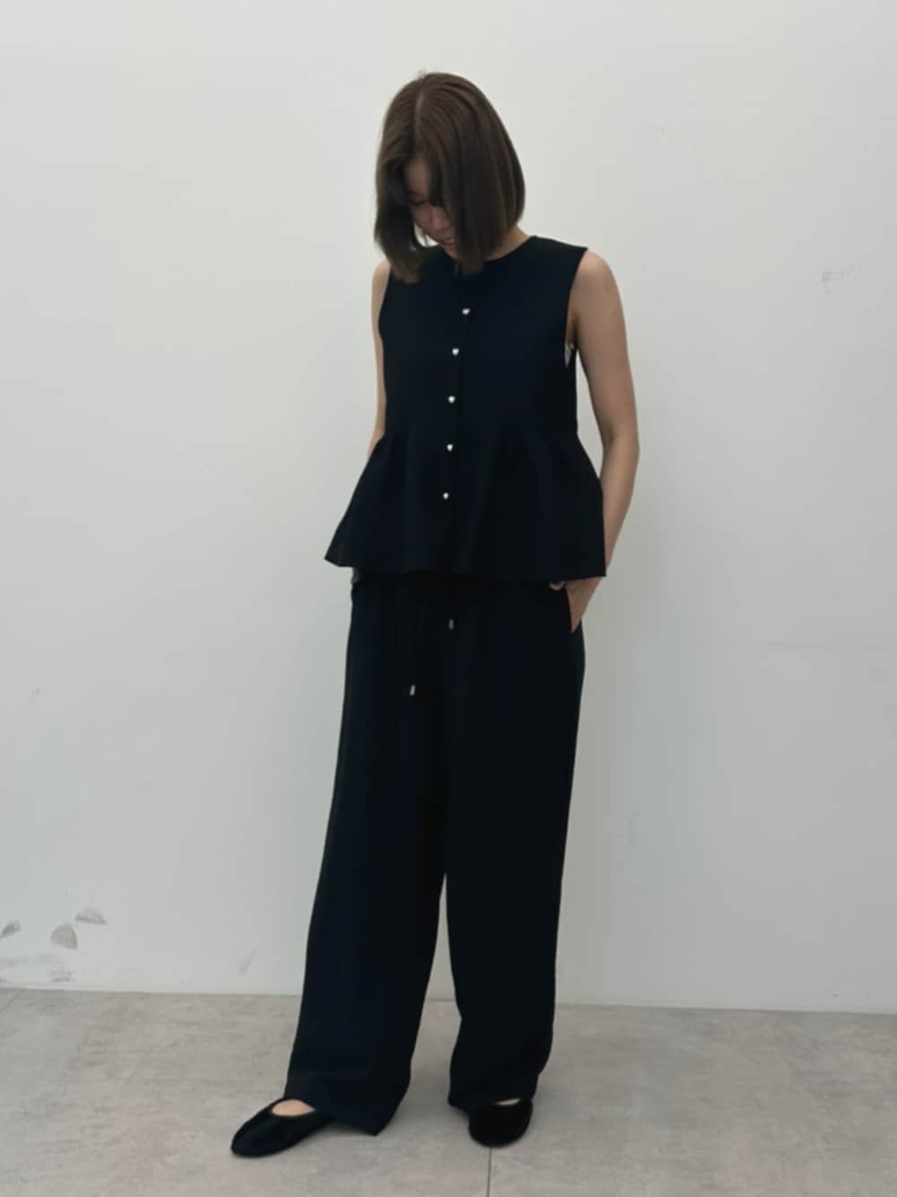 ========== ■シルバーボタンペプラムニットベスト M/Black 36-241226001-09 ¥1,990 →実店舗/WEB 販売中 ■シボサテンライクイージーパンツ M/Black 36-230314003-14 ¥1,990 →実店舗/WEB 販売中 ==========