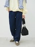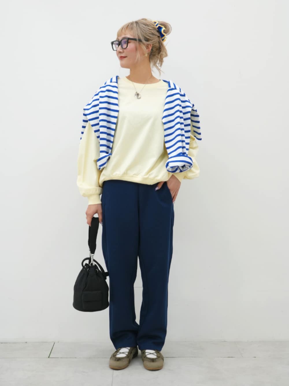 ■ソフトスウェットカーブパンツ 46-240933001-04 S/Navy着用 ¥1,990 ■T-スウェットビッグシルエット 26-250541002-16 S/Yellow着用 ¥1,490 ■デザイン・シルエット カーブシルエットで程よくゆったり、リラックス感のあるロングパンツ。 ウエストゴム仕様でラクに着られ、無理のないフィット感が魅力です。 無地デザインで、セットアップでも単品使いでもコーディネートしやすい1枚。 ■素材 ・ダンボール素材のソフトスウェットで肌触りが良く快適 ・伸縮性があり動きやすい ・イージーケアで洗濯やお手入れも簡単 ■コーディネート Tシャツやブラウス、ジャケットと合わせて、オンオフどちらも活躍する大人カジュアルに。 セットアップで合わせればワンランク上のこなれコーデに。 足元はスニーカーやフラットシューズで抜け感をプラスすると、リラックス感とスタイルアップを両立できます。