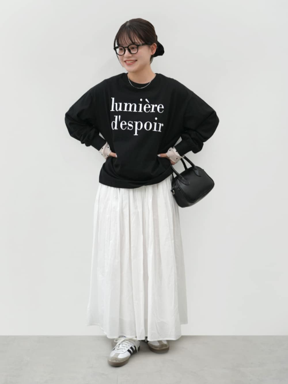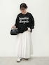 【Staff:152cm 骨格:ストレート】 ・コットンビッグシルエットロゴTシャツ(S/Black着用) 🏷26-250533002-16 ¥990 ・コットンボイルフレアスカート(Short/White着用) 🏷01-181037901-29 ¥1,990