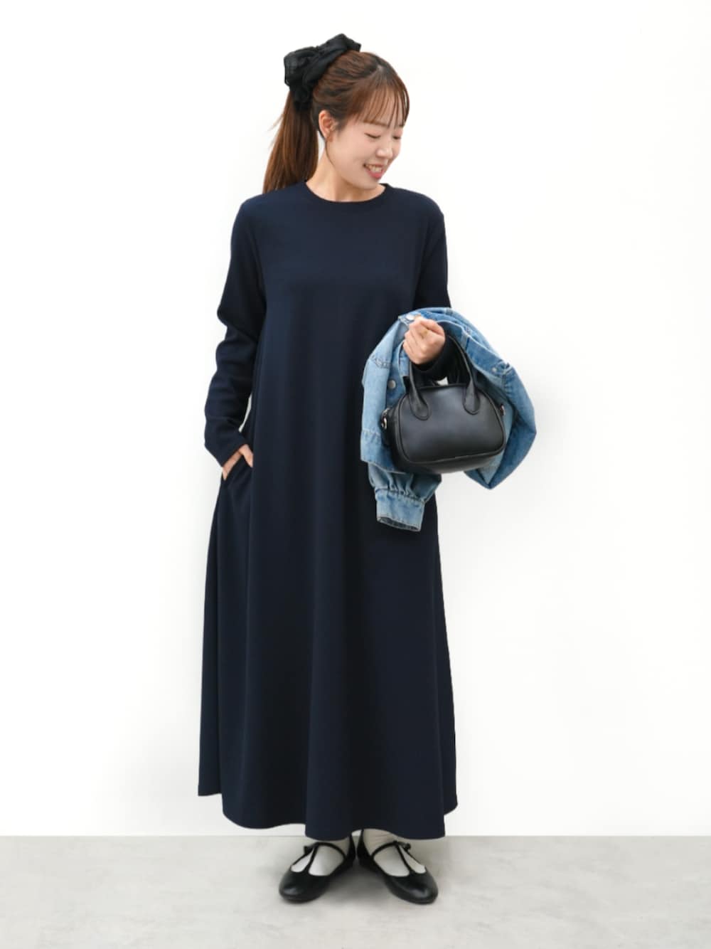 【Staff:160cm 骨格:ウェーブ】 ・エンボス長袖Aラインワンピース(M/Navy着用) 🏷46-200817002-01 ¥1,990