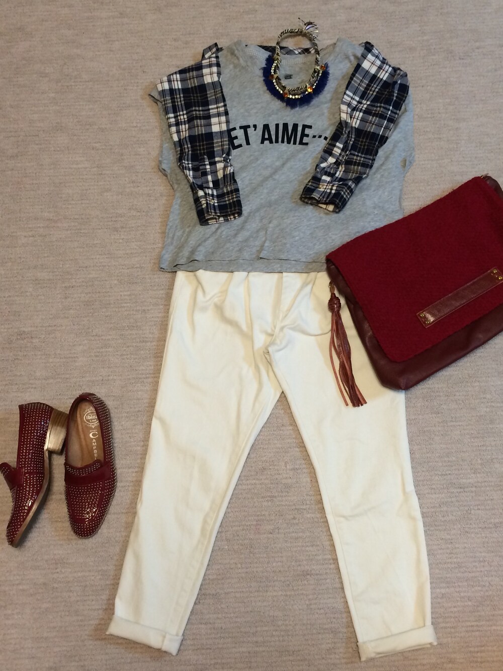普段はオフィスでTシャツNGなので、休日子供とのお出かけに… Tシャツ…GU チェックシャツ・ネックレス…ブランド不明 ホワイトデニム…ローリーズファーム
