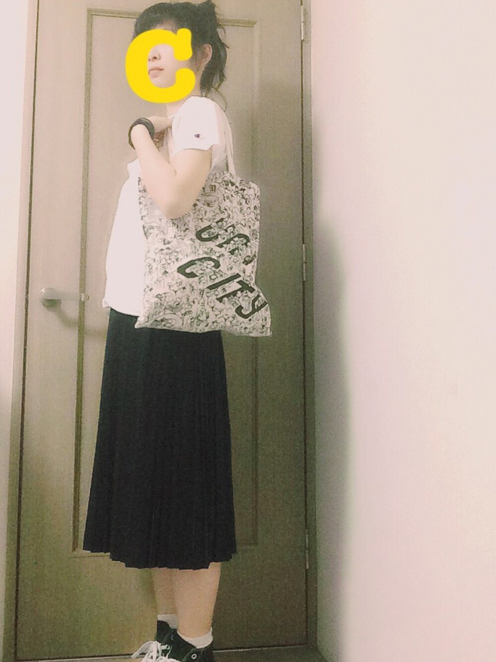 休日だったのでお買い物へ! KBFのチャンピオンTシャツは とっっってもお気に入りで 色違いを買わなかったことを 後悔しまくっております 💔 髪の毛は適当おだんご! とってもシンプルだったので、 バンドのトートバックを 👜