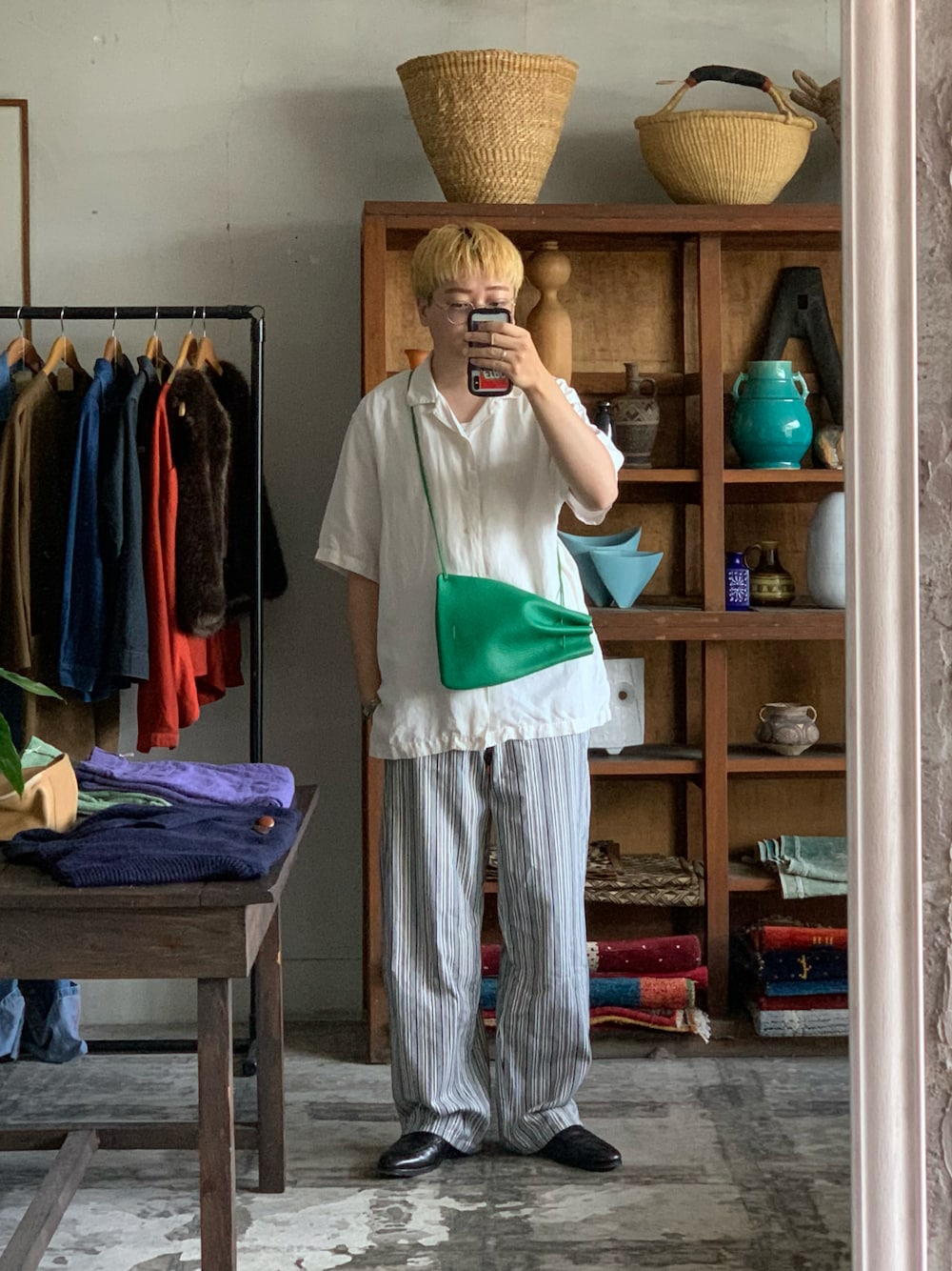 靴がエドワードグリーンなので バッグもグリーンにしました 今日も暑いです