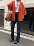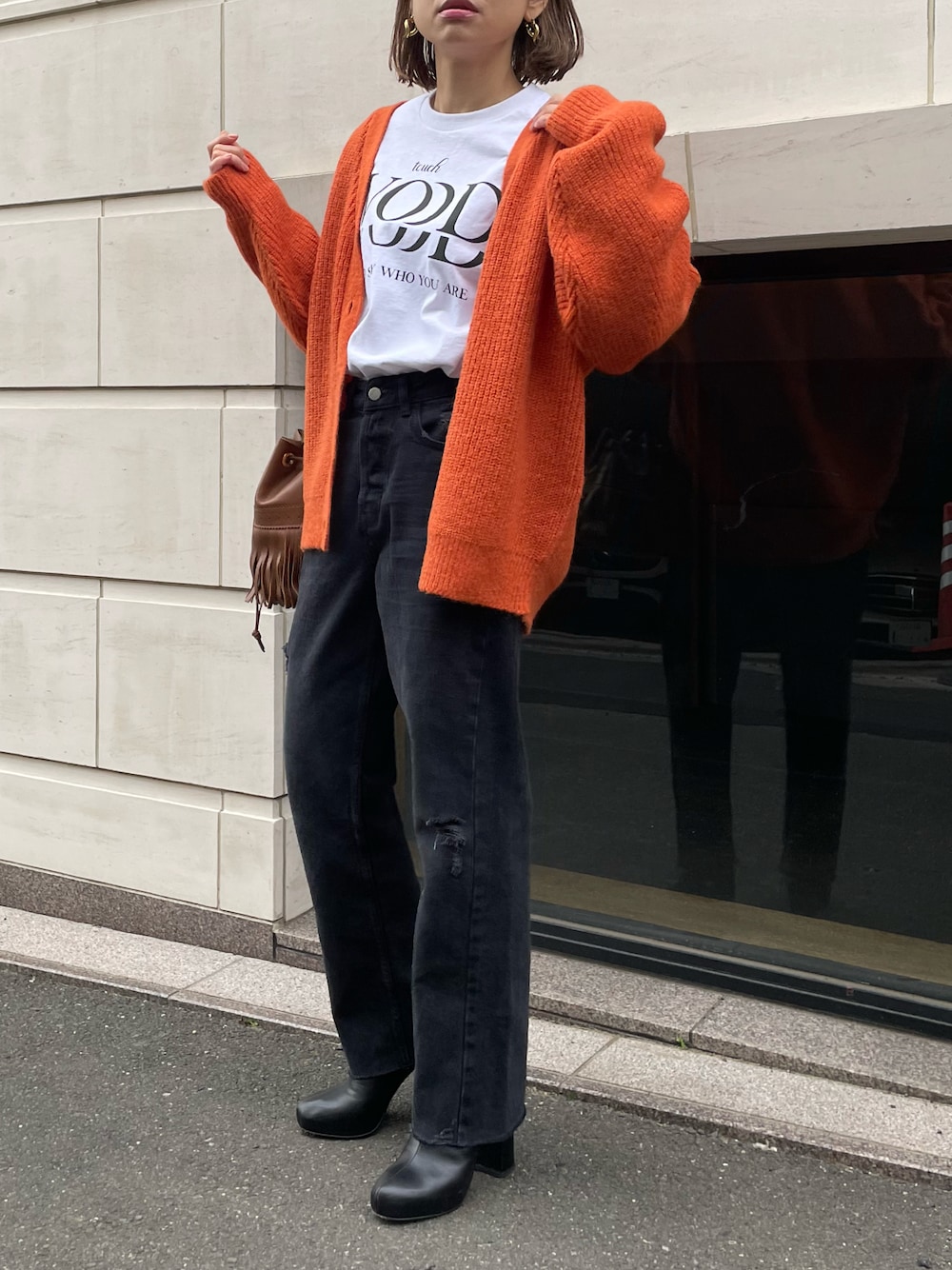 ご覧いただき、ありがとうございます⭐︎ オレンジがカワイイ 🧶Vネックニットカーデ🧶 × ロゴロンTと、デニム合わせで。 カーデなので、ロンT合わせで、まだまだ使えます✨ カラーがカワイイので春らしくなります!!