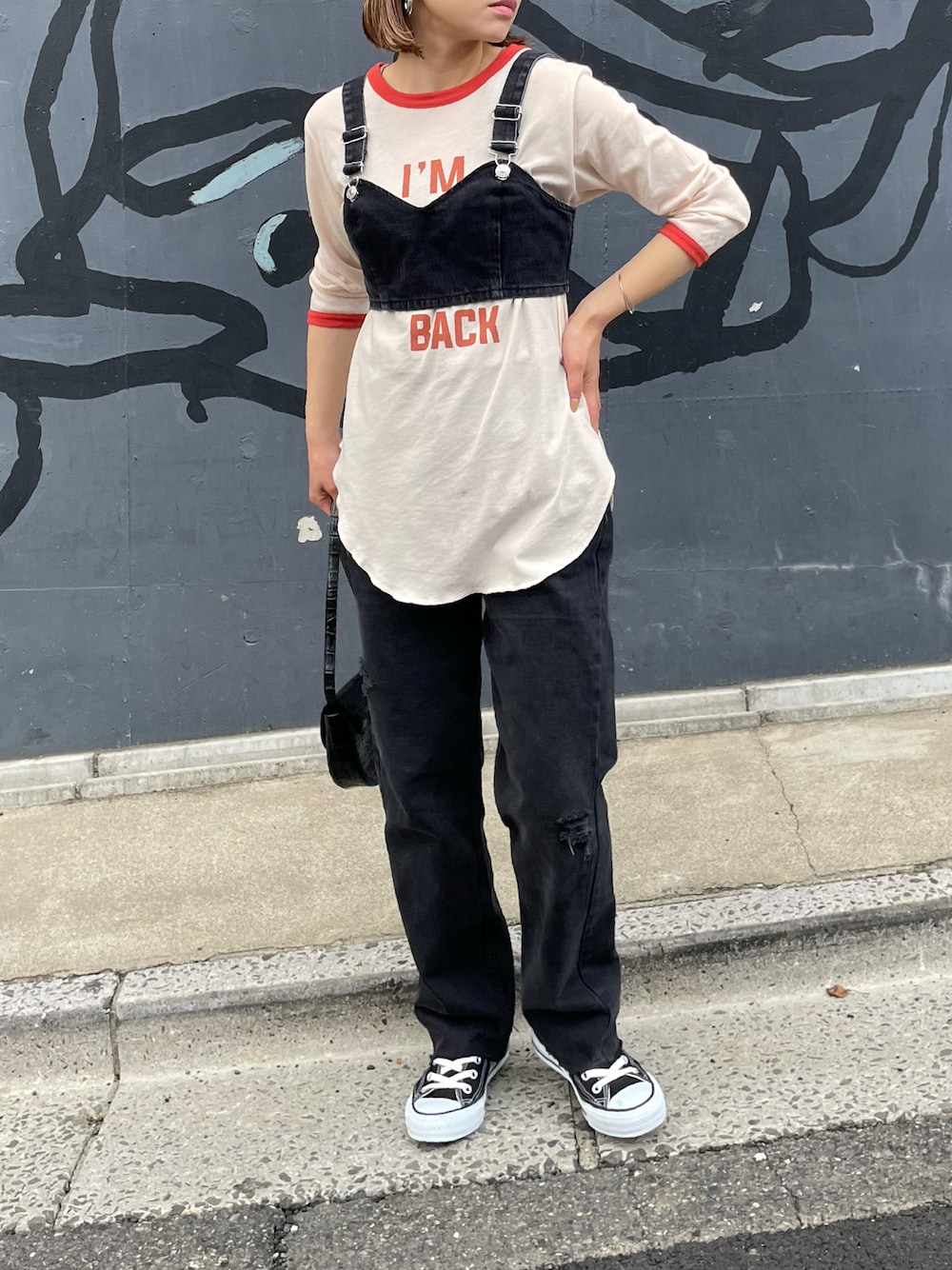 ご覧いただき、いつも、ありがとうございます⭐︎ 🍎シアーリンガーロゴTee🍎 × デニム合わせ コーデ。 繊細な細い糸のコットン100% Tシャツ素材の天竺生地がカワイイ、 シアーリンガーTee。 ビスチェとレイヤードで、 ロゴをチラッと見せても、 衿とロゴが同色でカワイイです✨