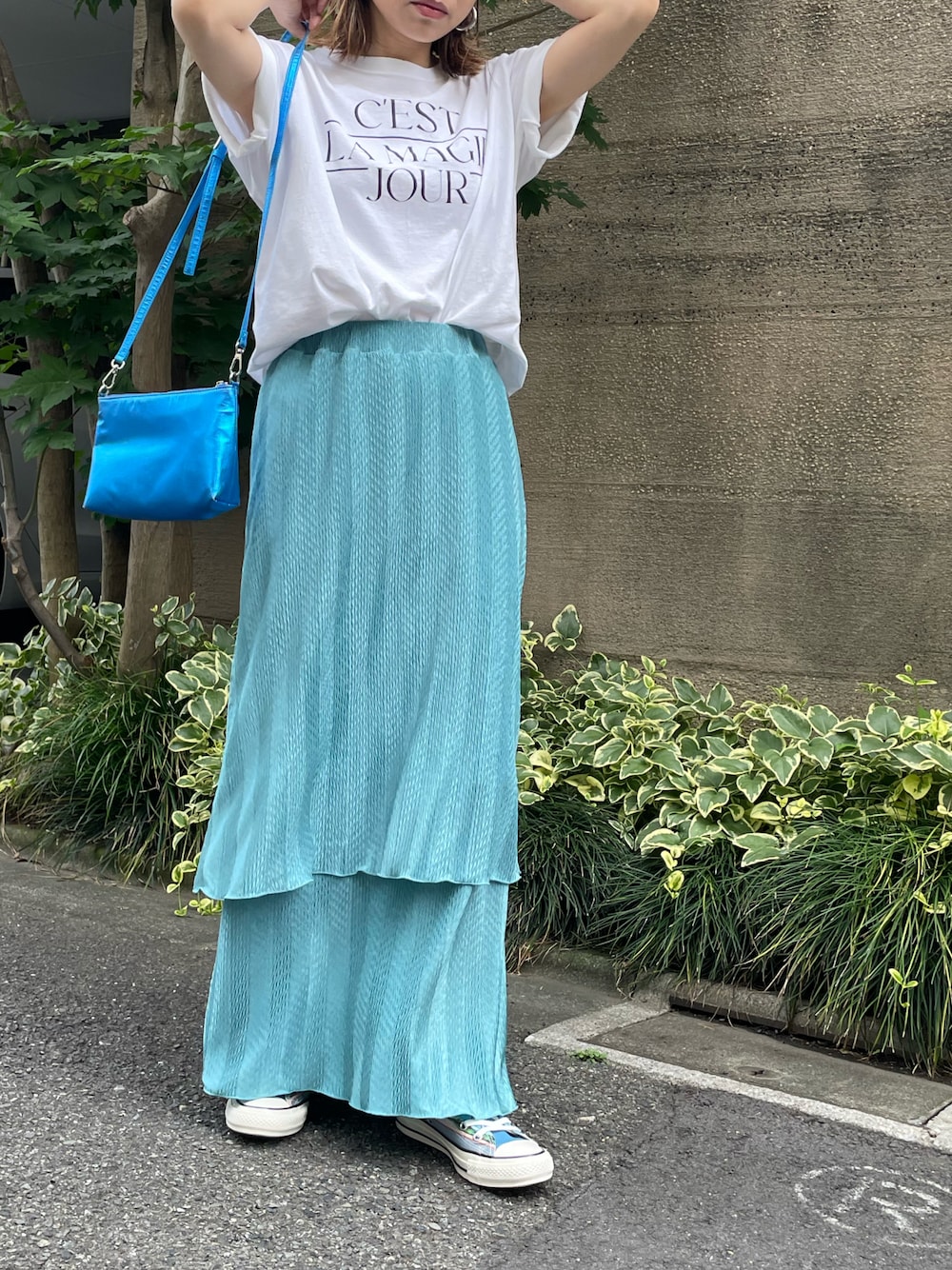 ご覧いただき、いつも、ありがとうございます⭐︎ 💎シャイニープリーツのレイヤードスカート💎 & 🥐FRUIT OF THE LOOMのフレンチロゴT🥐 今日はクーポンで、スカート、お得に買えます!タイムセールも! 💎シャイニープリーツのレイヤードスカート💎は、 シャイニーな生地に柄プリーツが入っている生地がレイヤードされているスカート✨ 1枚で映えます✨ ウエストゴム仕様で、リラックス感も! iラインめのシルエットでコーデに取り入れやすい、夏コーデに使えるアイテムです✨ 🥐フレンチロゴT🥐は、 FRUIT OF THE LOOMのTeeに、フレンチロゴ入り!使いやすいアイテムです♪