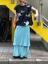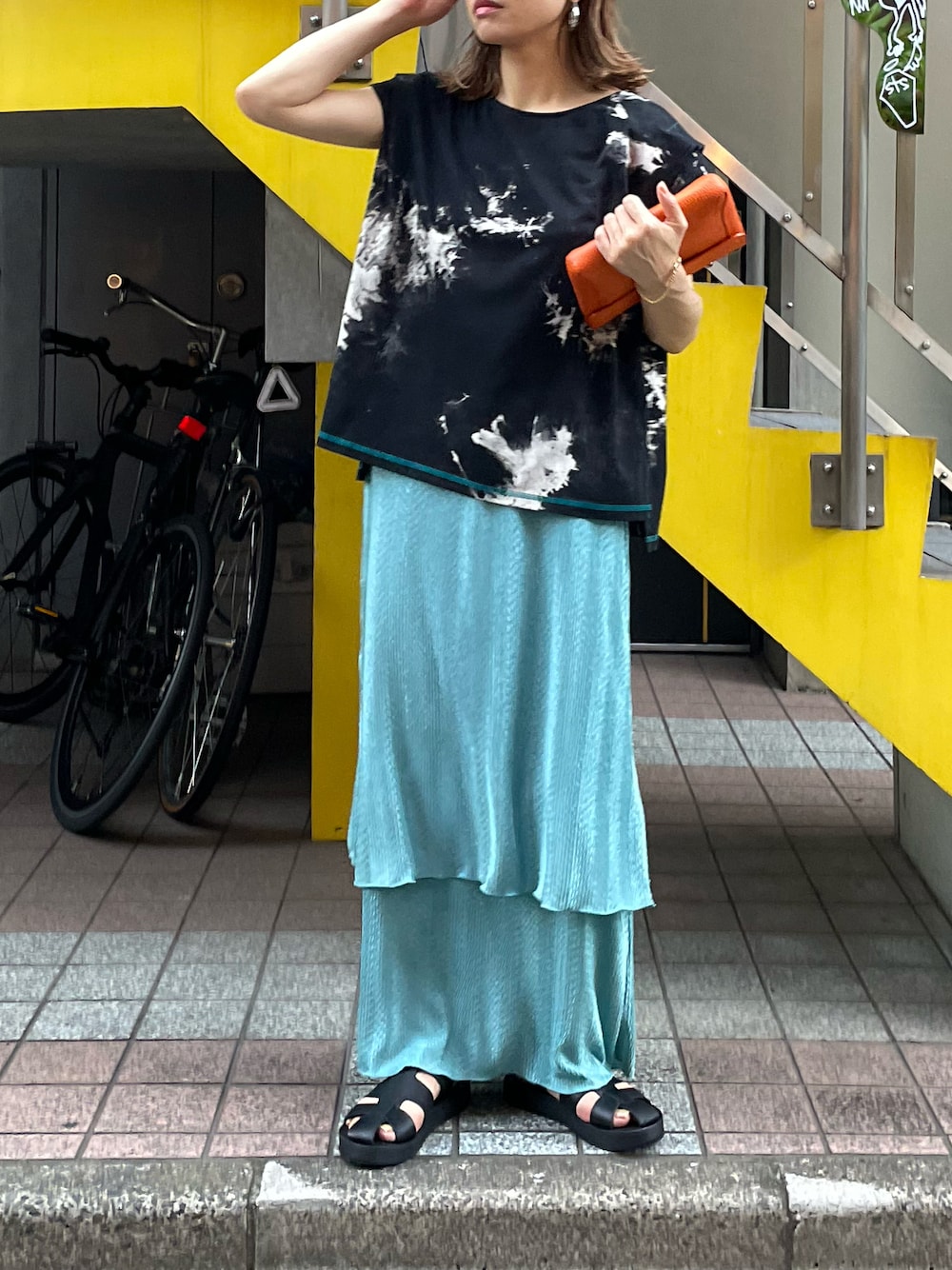 ご覧いただき、いつも、ありがとうございます⭐︎ 🫐スモーキーなダイダイ柄Tee🫐 & 💎シャイニープリーツのレイヤードスカート💎 × グルカサンダル 🫐スモーキーなダイダイ柄のTee🫐は、 肩ににタックと、配色ステッチが入った デザインTee✨ 人気のダイダイワンピと同生地です! ストレッチのきいたTシャツ素材で、 着心地も◎ ダイダイ柄ですが、カラーと柄が大人っぽくて使いやすく、映えるアイテムです✨