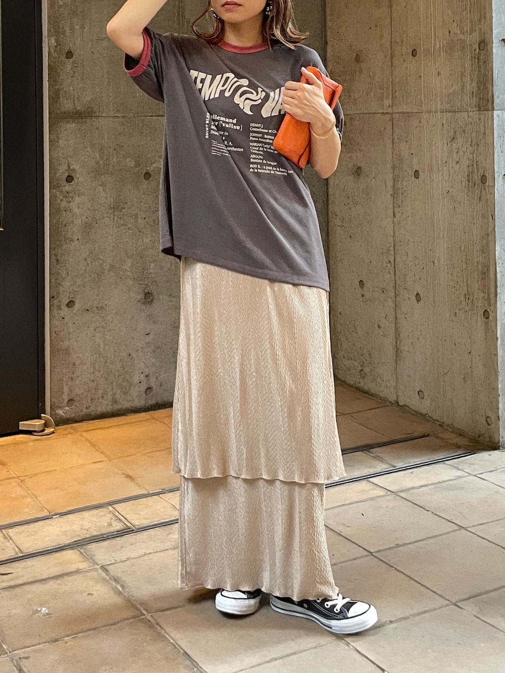 ご覧いただき、いつも、ありがとうございます⭐︎ 🍒リネンライクスラブのロゴリンガーT🍒 & 💎シャイニープリーツ レイヤードスカート💎 🍒リネンライクスラブのロゴリンガーT🍒は、 Vintageライクなロゴがカワイイ、リンガーT✨ リンガーの配色が、くすみピンクでカワイイです! 💎シャイニープリーツ レイヤードスカート💎は、 シャイニーな光沢感のあるプリーツ生地がレイヤードされたスカート! ウエストゴム仕様で、楽ちんです!