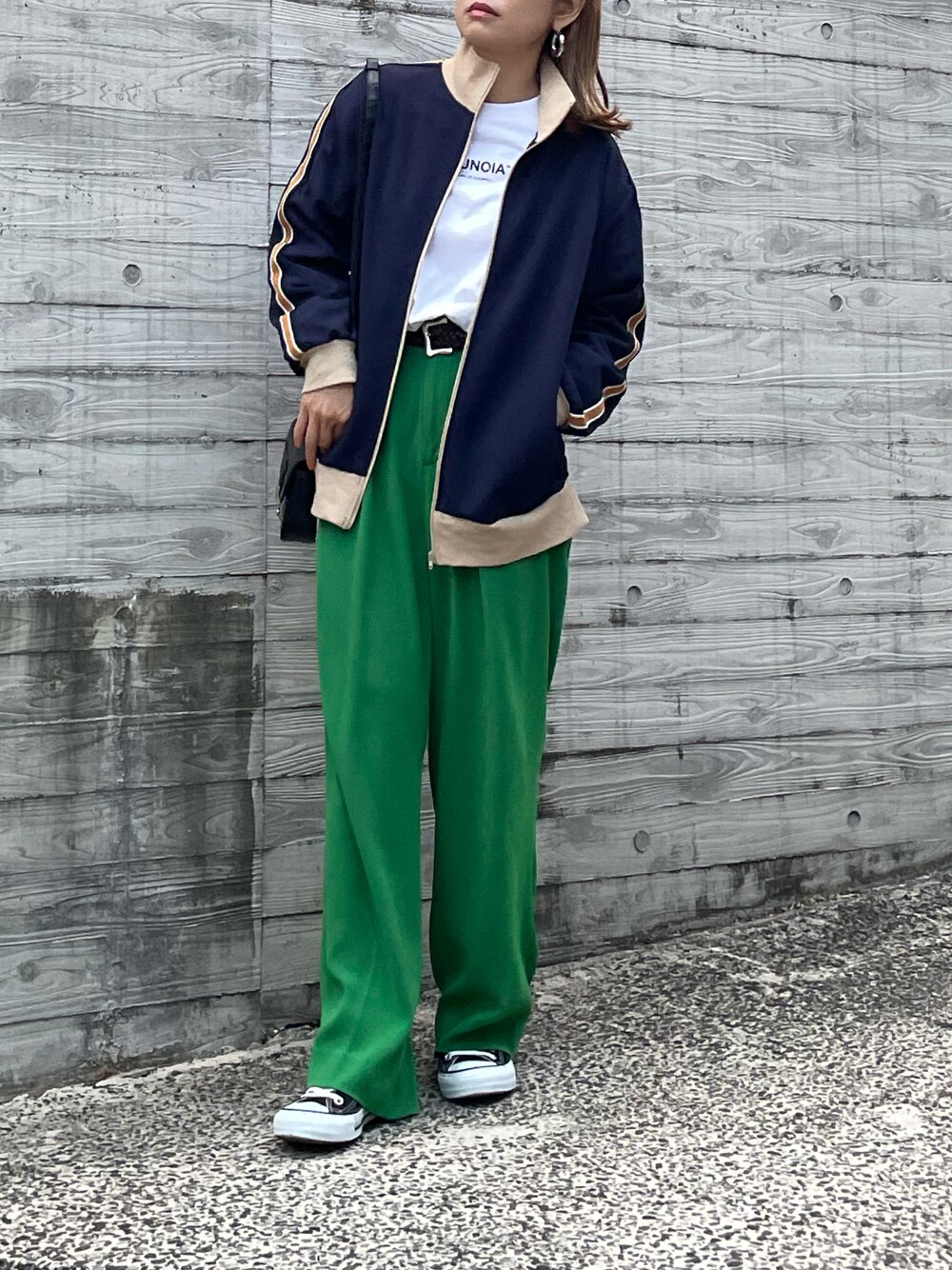 cocoのジャージ「Vintageライクライン ハイネックトラックジャケット」を使ったコーディネート