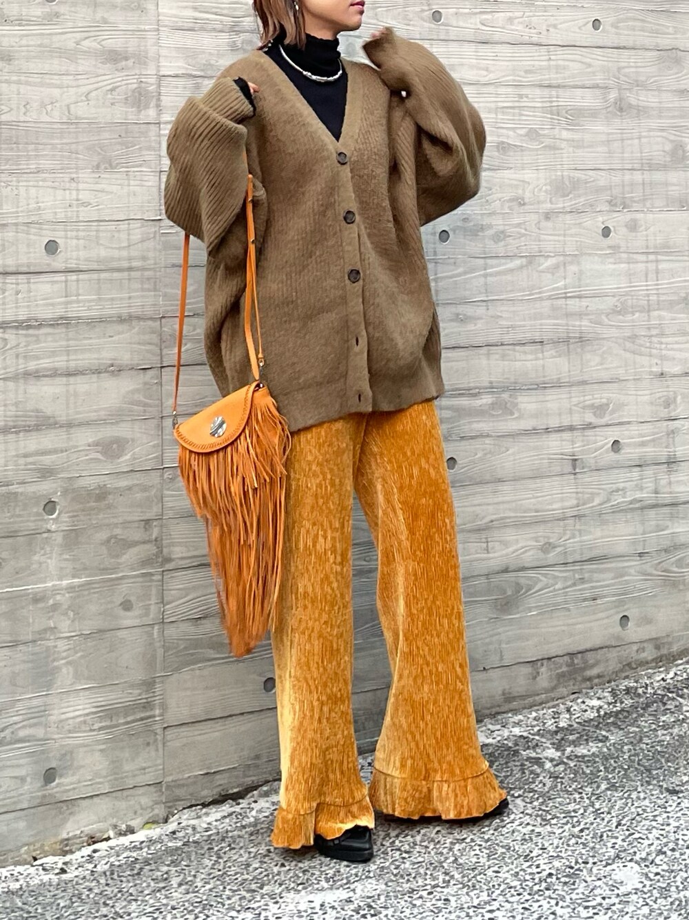 ご覧いただき、いつも、ありがとうございます⭐︎ 🍬ウール混 MIXニットVネックカーデ🍬 & 🍫ベロアプリーツ 裾フリルパンツ🍫は、 お気に入り登録で、クーポンなどお知らせがきます! 🍬MIXニットVネックカーデ🍬は、 ウール混で、寒い日にも◎ ブラウンは、色々な色が混ざったMIXニットでカワイイ✨ ビッグシルエットですが、落ち感もあり、 コーデに取り入れやすいです! 🍫ベロアプリーツ 裾フリルパンツ🍫は、 ゆとりのあるサイズ感なので、 暖かレギンスなどをインナーに着用して、 これからのシーズンも!