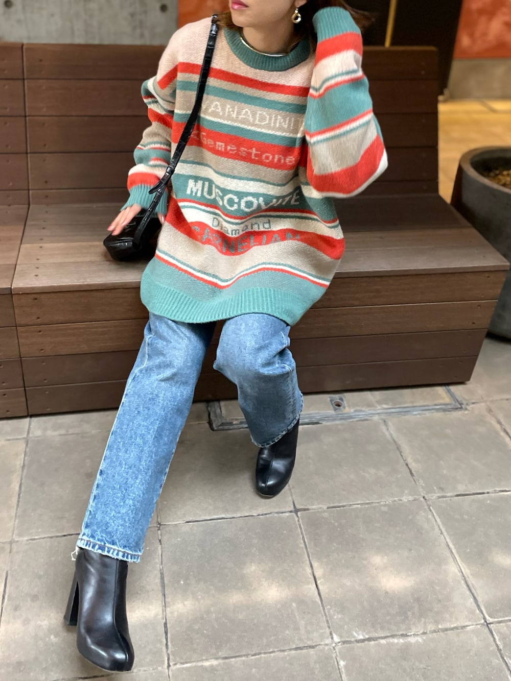 ご覧いただき、いつも、ありがとうございます⭐︎ 🥤マルチボーダーロゴのジャガードニット🥤 ×デニム 🥤マルチボーダーロゴのジャガードニット🥤は、 カラーがカワイイ、ビッグシルエットのニット✨ マルチボーダーに、宝石💎名のロゴが フロントにだけ入って◎です! ビッグシルエットですが、柔らかく、 程良い落ち感があって、 インナー、アウターに合わせやすいです! インナー次第で、長い期間着用できます✨