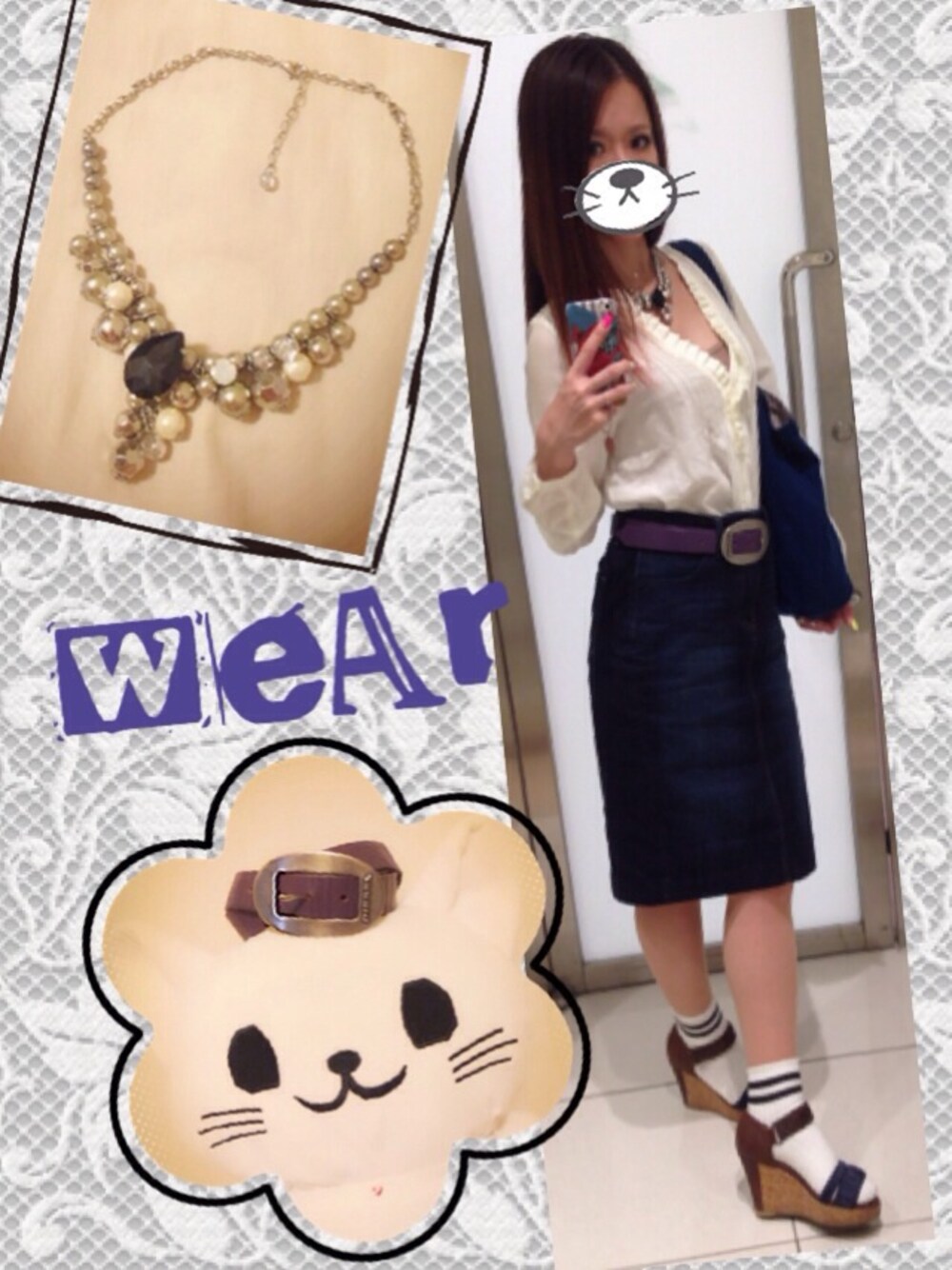 シンプルなコーデなので、パープルのベルトとビジューネックレスで小物をアクセントにしました(*^^*)♡ にゃろめっっ🐱 膝丈のデニムスカートはUNIQLO30周年SALEで1400円♡及びマルイの10%OFF‼︎