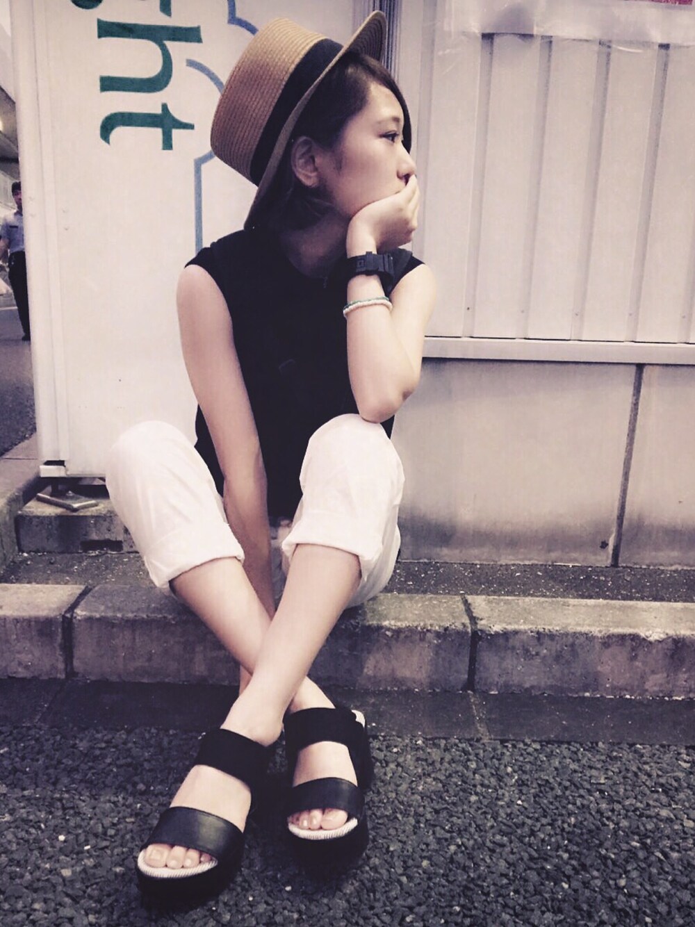 ブルー系のニット/セーター、ホワイト系のチノパンツ、ベージュ系の帽子を着用したレディースの夏コーディネートの1枚目の写真
