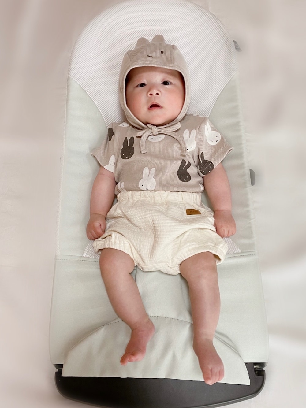 naaaのロンパース「【miffy 】 総柄半袖ロンパース×耳つき帽子セット」を使ったコーディネート
