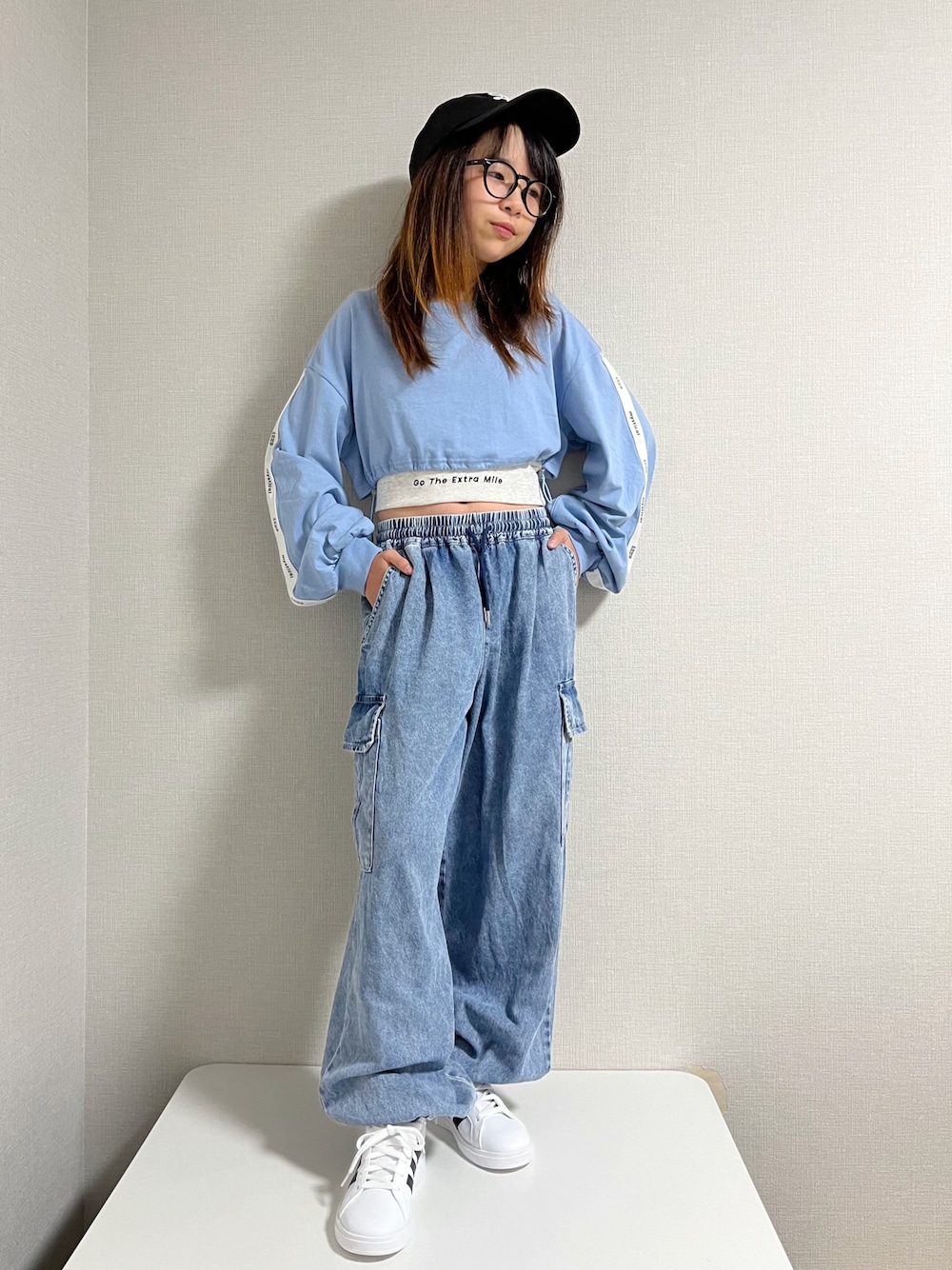 昨日のスウェットパンツは ・短丈長袖Tシャツ3点SETUPだったので今日はその上の2点セットとGUのカーゴパンツ合わせ🩵💙 SETUPも可愛いけど色んな組み合わせが出来てよき🫶
