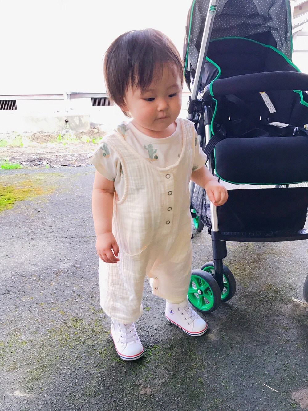 初めてのお熱にやられ久しぶりのお散歩。じめじめした梅雨の時期にさらっとした生地で過ごしやすく。紙がだんだんのびてきて、今日はぼさへあー。笑。はやく結べるといーな♡