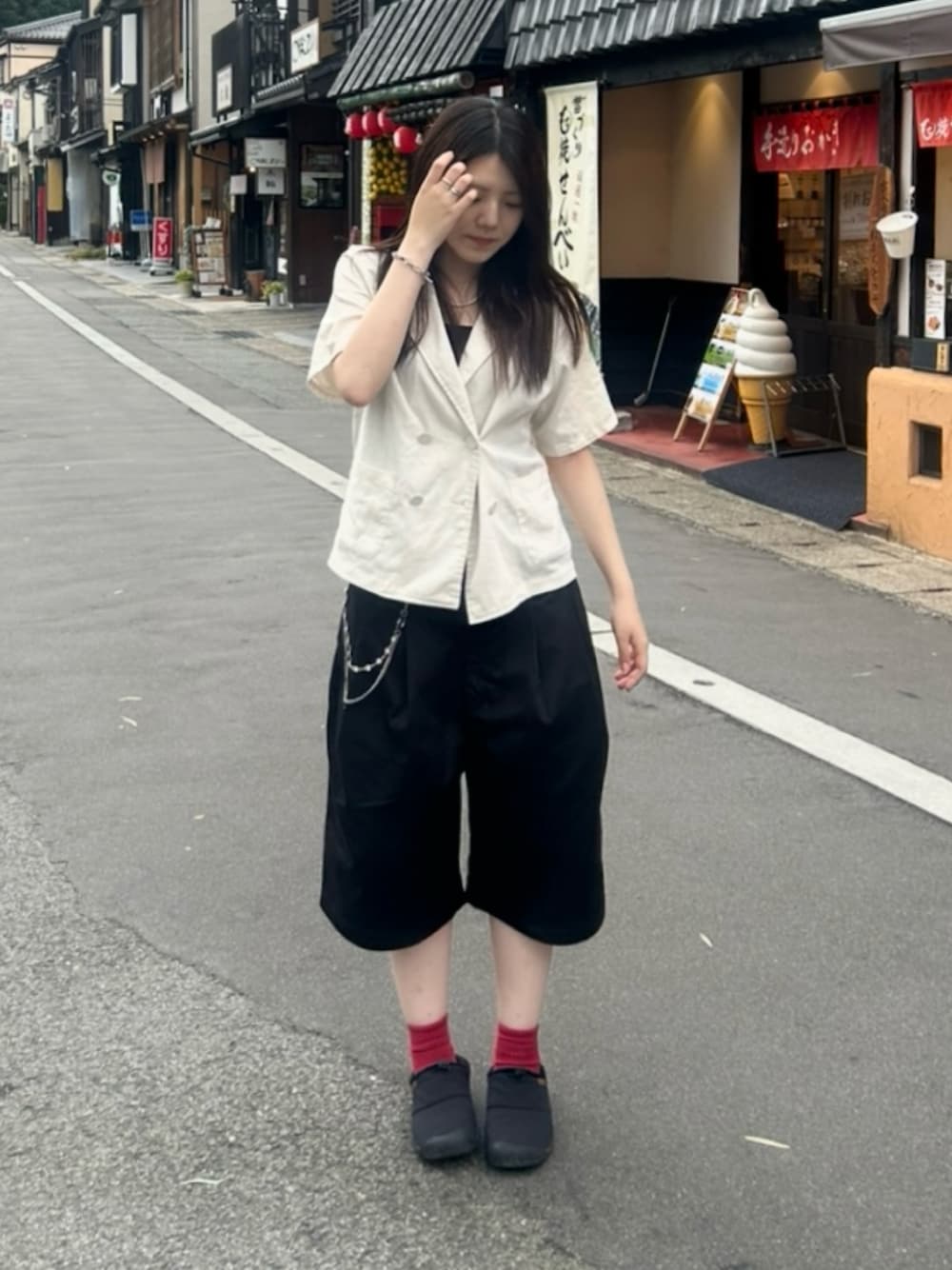 ご覧いただきありがとうございます🎀 ジャケット風のシャツを重ねることで綺麗めな印象に!アクセサリーを沢山つける事で寂しくないようにしてます! Instagram. c____5.auy