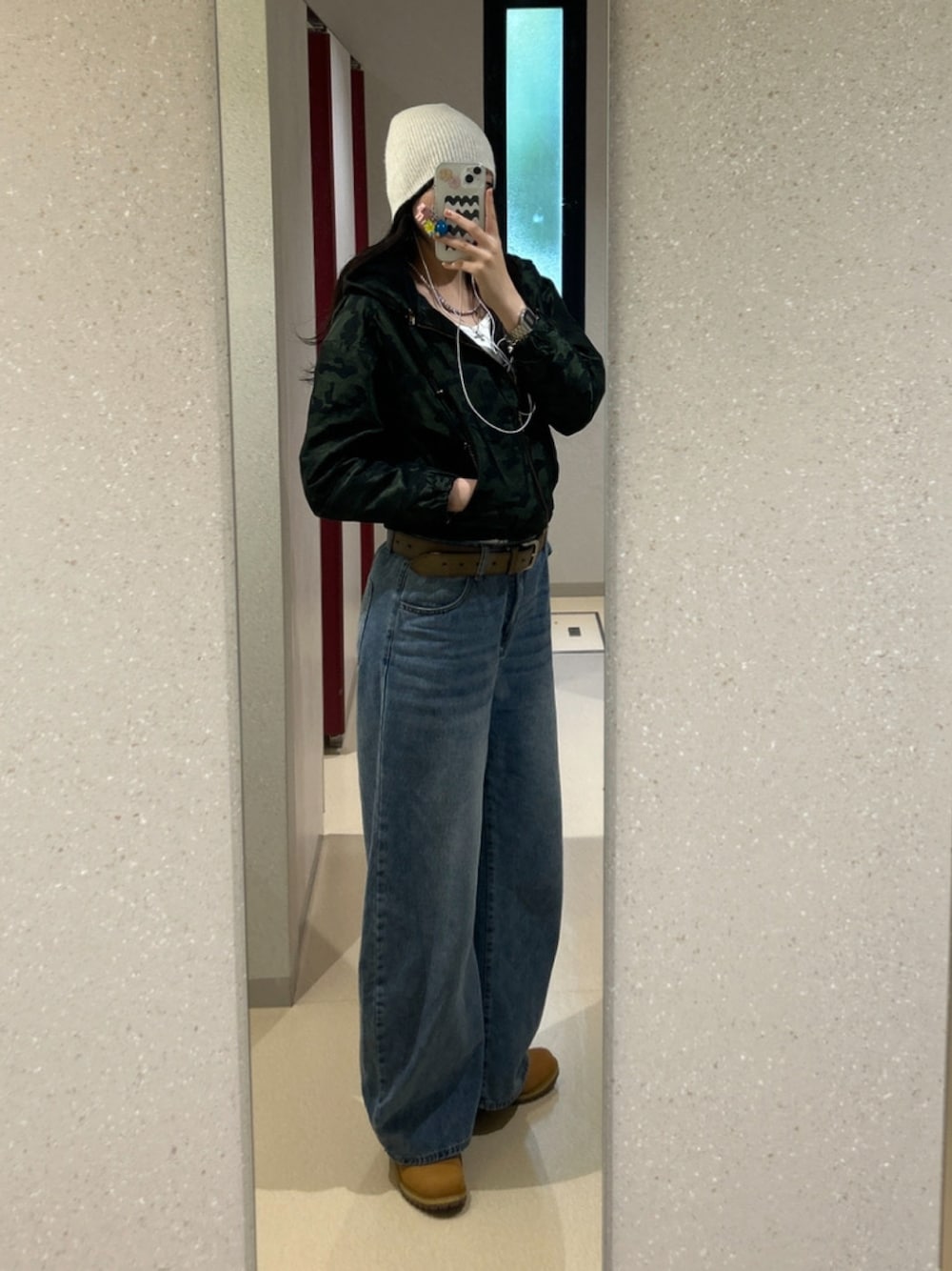 ご覧いただきありがとうございます🎀 肌寒くなってきたので迷彩柄の薄手のアウターを着て色味が重たくなりすぎないようにトップスやビーニーに白を入れました!