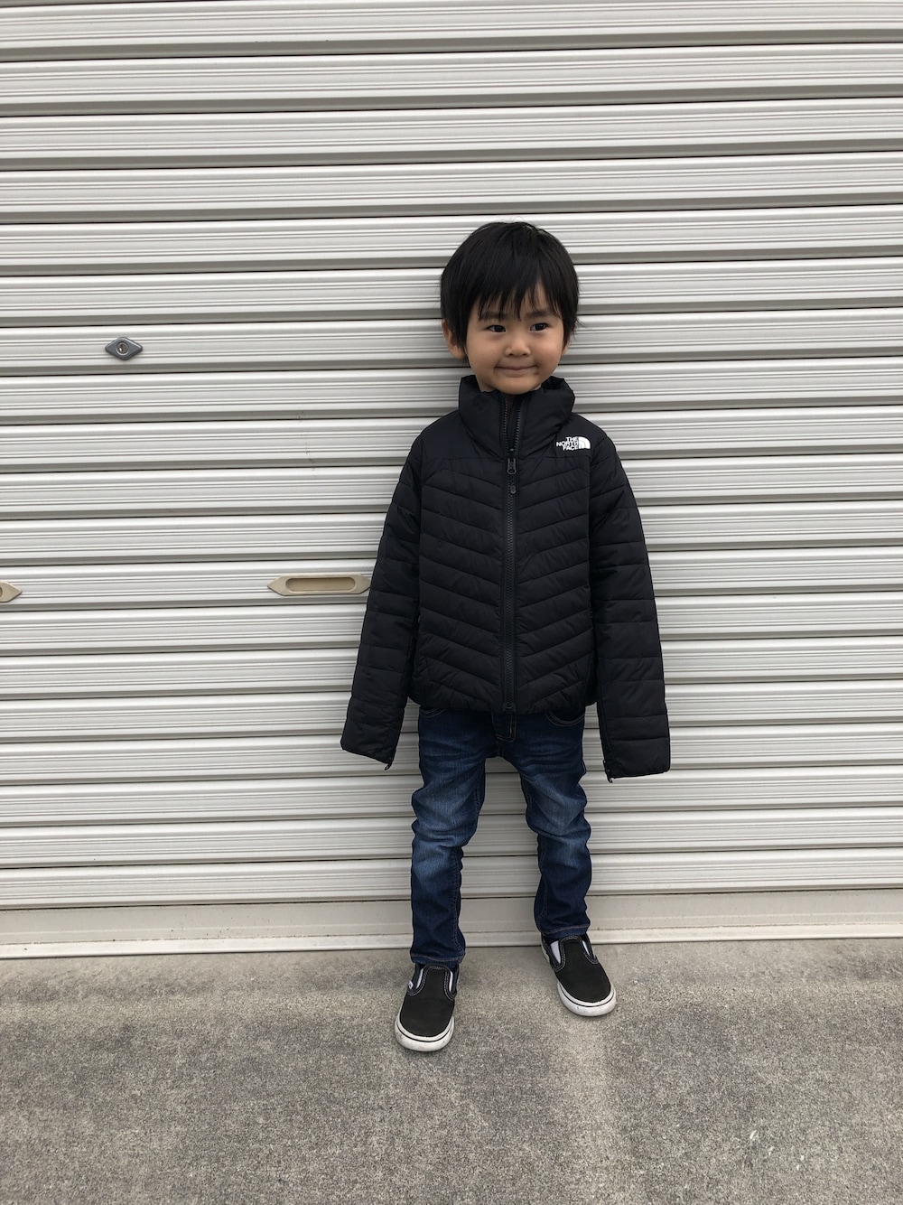 みなむしこのナイロンジャケット「ザ・ノース・フェイス キッズハイブリッドダウンパーカー / サンダーフーディ」を使ったコーディネート
