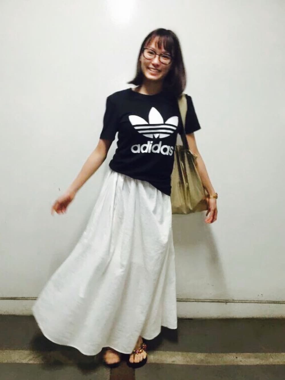 白のマキシスカートにadidasのロゴT👕 シンプルにモノトーンコーデにしました♪ Twitter:@cocoron_n5 Instagram:@cocoron.n